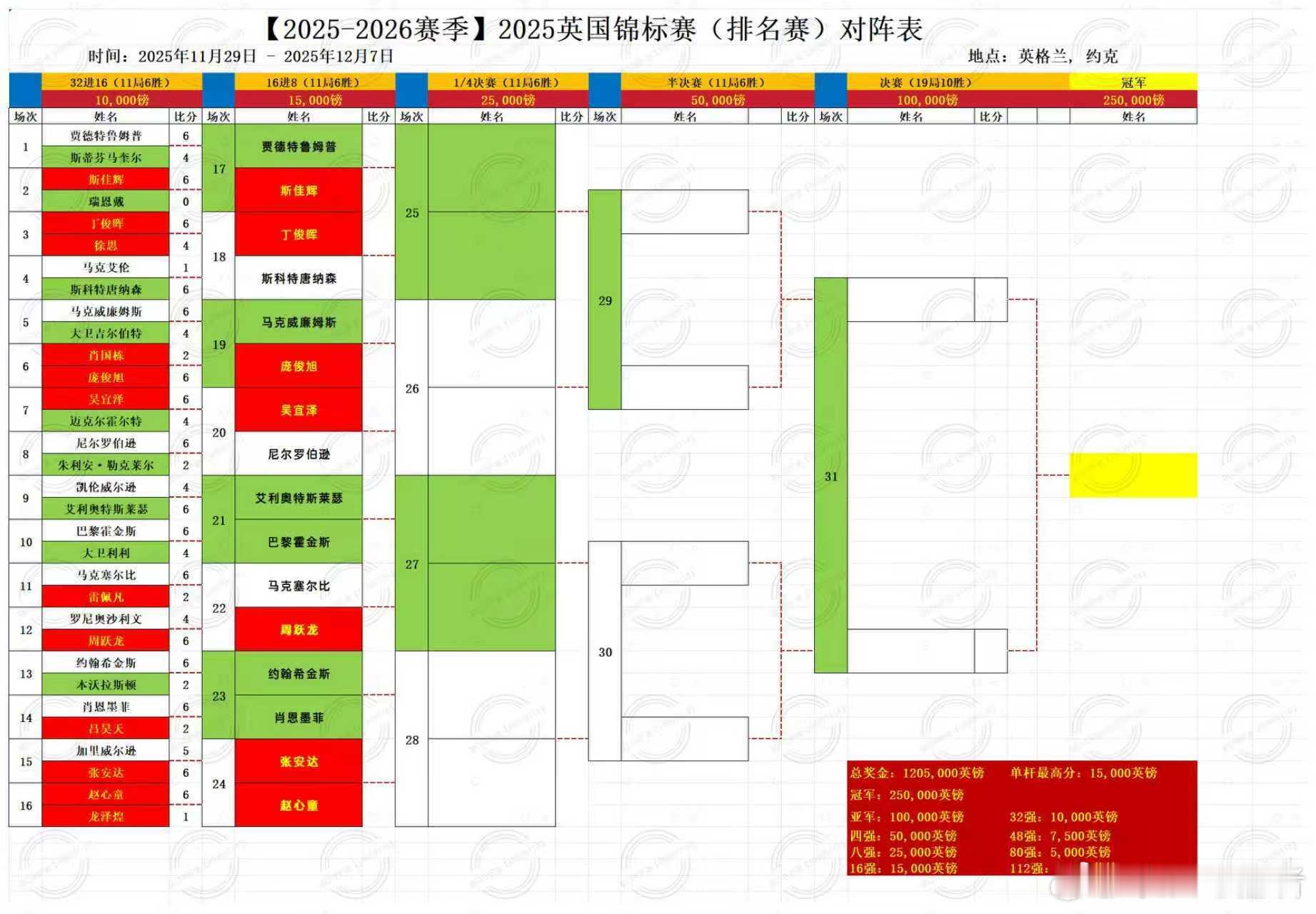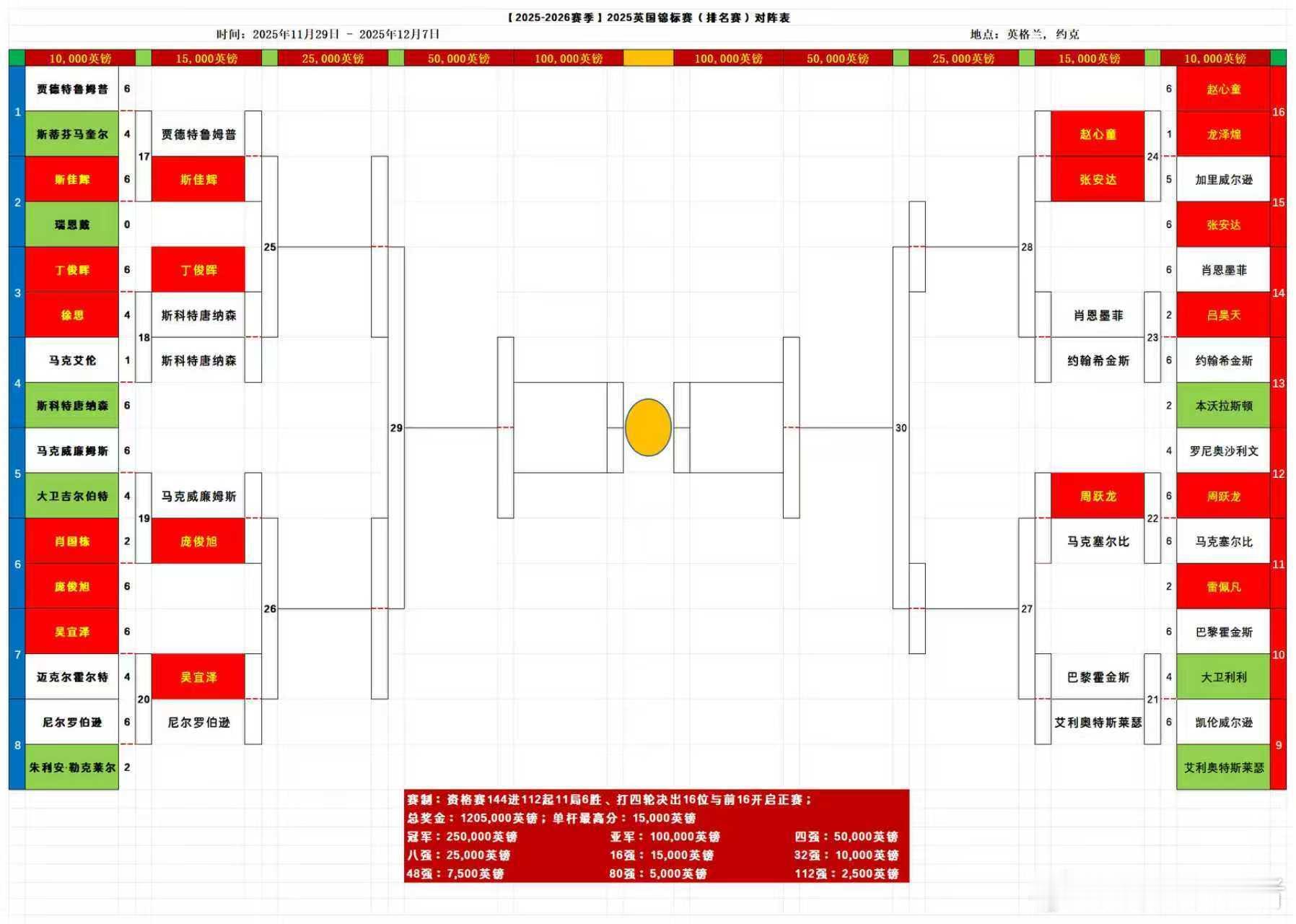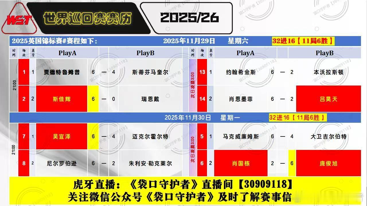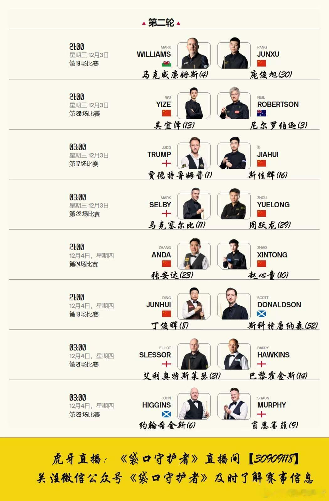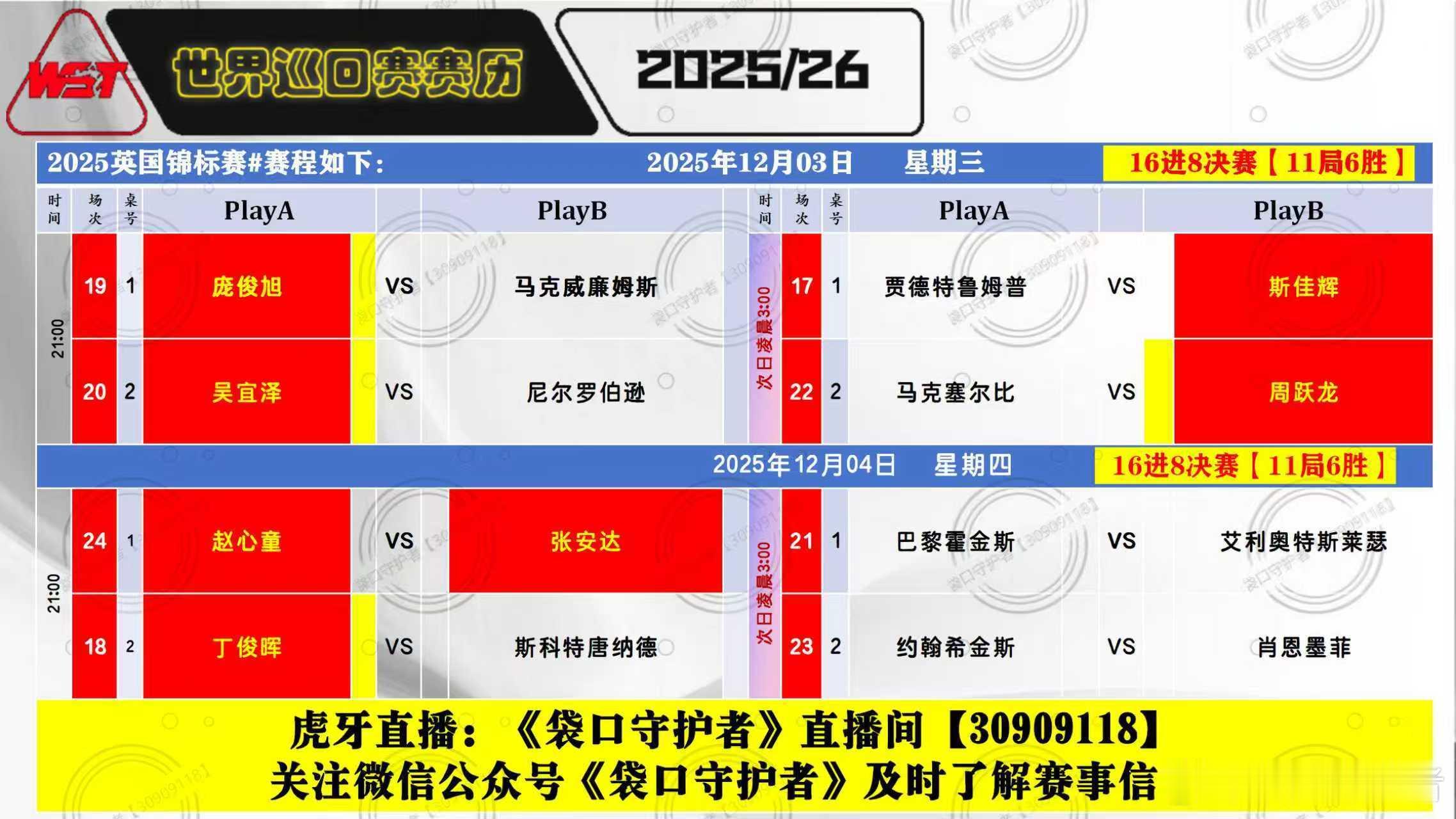 2025英国锦标赛16进8(11局6胜)中国选手斯佳辉、丁俊晖、庞俊旭、吴宜泽、周跃龙、张安达、赵心童等七位晋级16强2025.12.03日 星期三21:00 直播: 吴宜泽VS尼尔罗伯逊2025.12.04日 星期四3:00 直播: 斯佳辉VS贾德特鲁姆普