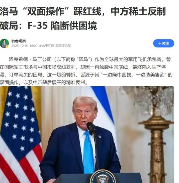 11月30日,俄罗斯《消息报》报道:“美军工巨头洛克希德·马丁因参与对台军售、触碰一中红线,遭中国制裁后步入心衰死亡通道,核心稀土供应链被切断,F-35战机关键部件断供,本土及印度替代方案纷纷碰壁,生产线被迫减产,仅违约金就赔付8亿美金。 洛克希德·马丁最近的日子是真不好过,这家美国军工巨头算是实实在在尝到了触碰红线的代价。 事情的根子还是对台军售,三十年来他们卖给台湾的武器总额早突破200亿美元,占了台湾军购的四成左右,现在光没交货的订单就有191亿美金在手里。 2024年6月外交部就动了手,冻结了洛马相关实验室和高管的资产,董事长詹姆斯·泰克里特这些人直接被禁止入境。 到2025年初,商务部干脆把他们列进不可靠实体清单,不准搞进出口、不准新增投资,等于掐断了和中国市场的联系。 说白了,这都是他们一次次踩“一中红线”换来的后果。真正要命的是稀土供应链被卡了脖子。 每架F-35得用417公斤稀土,雷达里的钐钴磁体、发动机的高温涂层,缺了这些核心部件根本造不成。 中国现在占着全球91%的稀土精炼量,技术标准都是99.99%以上,洛马的供应链一下就断了。 五角大楼自己都算过,重稀土储备只够撑42天,生产线根本顶不住。 他们不是没找退路,美国本土重启了加州的矿山,可开采成本是中国的3倍,还大多是没用的轻稀土。 拉着印度搞替代更成了笑话,印度砸了42亿人民币搞计划,炼出来的东西纯度才82%,连磁铁都造不了。 印度最大的磁铁进口商SonaComstar直言,现在还得靠中国供货,试产要拖到2026年,根本指望不上。 这下生产线彻底扛不住了,减产30%不说,光违约金就赔了8亿美金。 2025年二季度净利润暴跌79%,F-35项目直接亏了1.6亿,更惨的是盟友们都在跑路,加拿大把订单从88架砍到16架,西班牙干脆退单转买欧洲战机,仓库里堆着的半成品只能当训练机用。 这事儿说到底,不是中国下手狠,而是洛马自己没数。 中国的稀土优势是几十年攒下的,从开采到精炼的全链条能力,美国和印度短期根本追不上。 商务部的管制也很精准,正常商业用途能批,但想拿去造武器对付中国,门都没有。 现在洛马的困境成了个明证:大国竞争里,供应链自主从来不是空话,触碰别人的核心利益,早晚要付出代价。 以上都是个人观点,对此您有什么不同的看法,可以在评论区留言讨论!!!