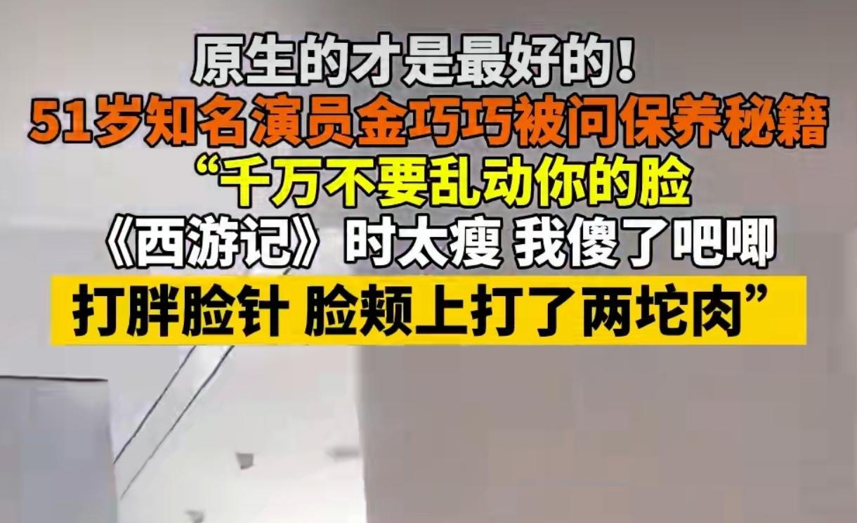 孔雀公主自曝黑历史!金巧巧为拍西游打胖脸针,51岁悟透原生最美 51岁的金巧巧也太敢说了!被问保养秘籍时直接自曝猛料,拍《西游记续集》时为了上镜好看,傻了吧唧去打胖脸针,结果脸颊肿得像塞了两块糖,现在后悔得不行。 这事儿得回溯到1994年,当时19岁的金巧巧刚出道,要演“孔雀公主”。她觉得自己太瘦颧骨高,上镜显凶,想让脸圆润点贴合角色,就跟风打了所谓的“胖脸针”,那会儿医美技术还不成熟,纯属瞎折腾。 谁知道效果完全失控,打针后脸颊直接膨出两坨肉,僵硬得很,连笑都不自然。杨洁导演都委婉提醒她“表情放松点”,剧集播出后,观众更是直接调侃“孔雀公主嘴里含着糖演戏”,这段经历成了她的黑历史。 后来金巧巧只能去做溶解手术,可修复起来难度极大,费了不少劲才恢复自然。如今时隔26年,她再提这事儿,满是懊悔,反复叮嘱大家“千万不要乱动你的脸,原生的才是最好的”。 现在的她心态特别坦然,还自嘲从当年的“孔雀公主”,变成了网友口中的“孔雀阿姨”“孔雀奶奶”。但她一点不抗拒年龄增长,说自己51岁的外表下,藏着25岁的内心,皱纹都是岁月的礼物。 想想当年的孔雀公主,一袭蓝纱裙翩翩起舞,可是无数人的童年白月光。金巧巧凭着这个角色火遍全国,后来还成了“公主专业户”,演了不少经典角色,演技和颜值一直在线。 她现在的状态是真不错,皮肤紧致有光泽,身材管理也到位,网友都说“说她30岁都信”。这可不是靠医美堆出来的,而是靠坚持运动、保持好心态,活得松弛又自在。 其实不光是金巧巧,很多人为了追求“完美”都瞎折腾过。尤其是年轻人,容易被“上镜好看”“冻龄”绑架,盲目跟风医美,最后反而破坏了自己的辨识度,得不偿失。 金巧巧坦言,年轻的时候不懂事,以为靠外力能变美,后来才明白,演员的核心是演技和作品,不是一张僵硬的脸。现在她更注重内在,这份通透和坦然,比精致的五官更圈粉。 网友们看完都特别有共鸣,留言说“原来孔雀公主也有容貌焦虑”“姐姐现在的状态比年轻时更从容”。确实,比起千篇一律的网红脸,这种真实自然的样子,才更有感染力。 她的经历也给大家提了个醒,追求美丽没问题,但得选正规机构,更不能盲目跟风。每个人的原生样貌都有独特魅力,没必要非要改成别人的样子,接纳自己才是最美的。 现在的金巧巧,不抗拒演妈妈、奶奶辈的角色,也不避讳谈年龄和过往的失误。这种敢于正视不完美的勇气,才是真正的强大,也让她在51岁的年纪,活成了更让人喜欢的样子。 岁月从不败坦然,原生之美最动人!真正的保养不是留住年轻的皮囊,而是接纳岁月的痕迹,活出内在的从容。愿每个姑娘都能懂,你本来的样子,就已经足够好!
