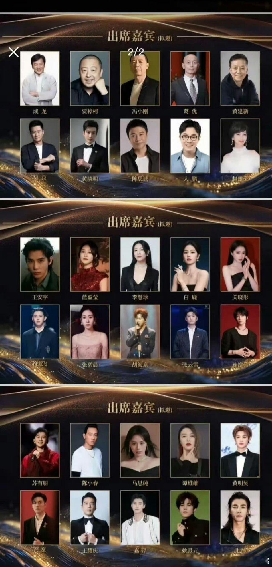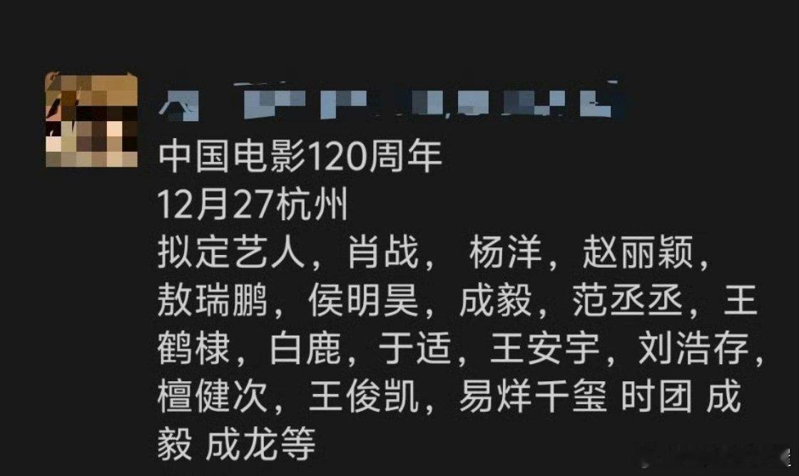 网传中国电影120周年拟邀嘉宾——肖战, 杨洋,赵丽颖,敖瑞鹏,侯明昊,成毅,范丞丞,王鹤棣,白鹿,于适,王安宇,刘浩存,檀健次,王俊凯,易烊千玺,时代少年团,成毅,成龙等