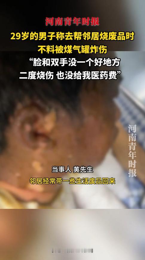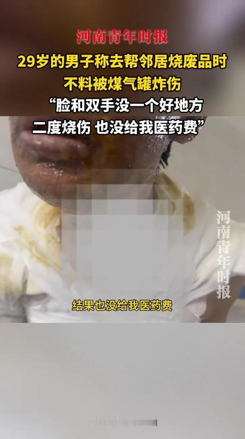“触目惊心!”近日,广东,一男子在家休息时,突然被邻居叫去烧垃圾,结果里面的煤气罐发生爆炸,将男子的脸和双手扎伤!男子向邻居索要医药费,没想到,对方却以自己被烫伤为由,要求男子赔偿!网友:搞不好是故意的。 现在有一些没有经济来源的老人,为了活下去,总是在垃圾堆中翻找,捡拾一些瓶子和纸箱卖钱,有时候他们也会遇到不认识的东西,不知道是否有危险就带回了家,而悲剧往往就是这么发生的。 据媒体11月30日的报道,男子的邻居经常捡一些废品带回家,将值钱的东西挑出来后,就把没用的都给烧了,碍于是邻居关系,男子在对方的请求下也不好意思拒绝,会帮忙一起烧垃圾。 这天,邻居不知道又从哪里搞来了一车垃圾,随后又让男子帮忙烧垃圾,推脱了几次后,男子还是过来帮忙了。 男子询问邻居有没有好好检查,不会漏掉什么危险的东西吧,邻居表示非常安全,可是烧着烧着,就发生了爆炸! 男子的脸和双手都被严重炸伤,涂满了药膏,不知道要多久才能恢复,也不确定是否会因此毁容。 可是令男子气愤的是,邻居不仅不愿赔偿,反而还向他索要医药费,真是太无理了! 网友看后表示,这种“烂好人”千万不能做,人家不仅不领情,反而还打算讹人,什么邻居不邻居的,碰到这种人就应该躲远点。 信息来源:《29岁的男子称去帮邻居烧废品时,不料被煤气罐炸伤,“脸和双手没一个好地方,二度烧伤,也没给我医药费”》黄河微视