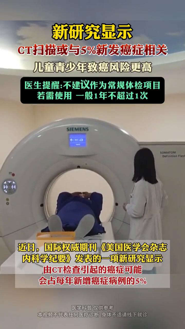 新研究显示,CT扫描或与5%新发癌症相关,儿童青少年致癌风险更高。 首都医科大学医学影像科副主任医师孙莹。 医生提醒:不建议作为常规体检项目,若需使用一般1年不超过1次。 近日,国际权威期刊《美国医学会杂志内科学纪要》发表的一项新研究显示,由CT检查引起的癌症可能会占每年新增癌症病例的5%。 首都医科大学医学影像科副主任医师孙莹表示,CT检查过程中会产生电离辐射,这种辐射具有一定的生物学效应,可使人体细胞DNA发生损伤。如果多次频繁进行CT检查,造成损害效应累积,可能有癌变风险。 CT检查的合适频次因人而异,一般遵循"必要且适度"原则。对于无特殊疾病症状或高风险因素的普通人群,不建议将CT作为常规体检项目,若需使用CT排查疾病应根据实际情况确定频率,一般1年不超过1次。CT检查 ct项目 ct是什么 ct检测 脑ct费用 儿童放射损伤 petct辐射