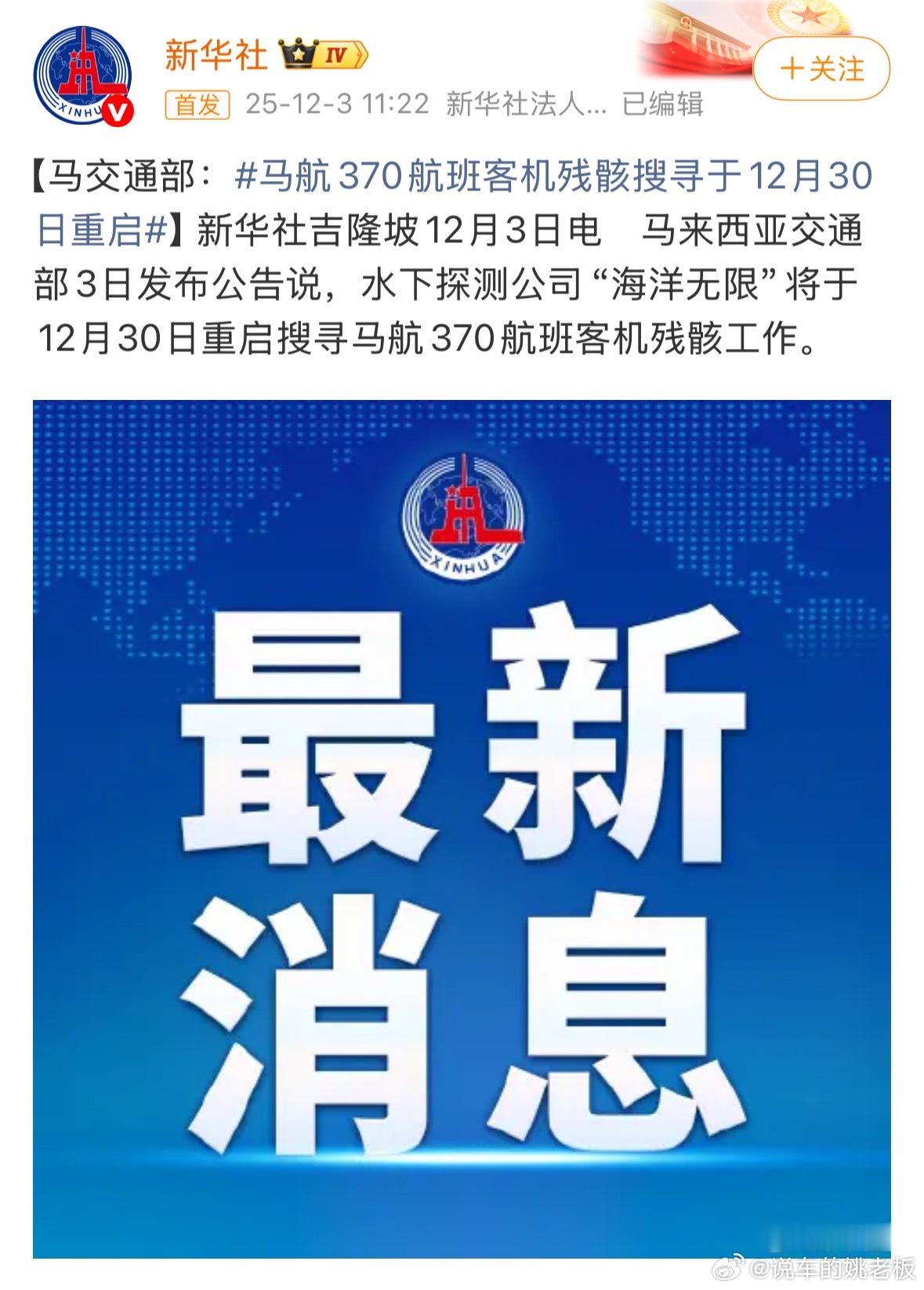 马航MH370已失踪11年马来西亚交通部3日发布公告说,水下探测公司“海洋无限”将于12月30日重启搜寻马航370航班客机残骸工作。这次用上升级的深海探测技术,AUV能下潜6000米精准扫描,还采用“无发现无收费”模式。239条生命,154名中国乘客,不管结果如何,愿这次能得知真相,给所有人一个交代!