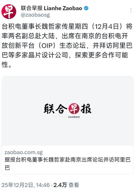 新加坡联合早报12月2日报道:“台积电董事长魏哲家传星期四(12月4日)将率两名副总赴大陆,出席在南京的台积电开放创新平台(OIP)生态论坛,并拜访阿里巴巴等多家晶片设计公司,探索更多合作可能性。” 台积电董事长魏哲家要率队来大陆了,这事新加坡联合早报12月2日刚报道,说他周四会带两名副总去南京,既要参加台积电的OIP生态论坛,还得拜访阿里巴巴这些芯片设计公司。 带队的魏哲家可不是第一次和大陆打交道,这位1953年出生的耶鲁博士,1998年就加入了台积电,从业务开发到总裁,再到2024年接棒董事长,研发、制造、运营各个环节都摸得门清,张忠谋都夸他是“准备最齐全的CEO”。 他之前还当过台积电南京公司的董事长,2023年去过上海开技术论坛,对大陆市场不算陌生。 这次去南京的OIP论坛挺有讲究,这是台积电2025年全球巡回论坛的最后一站,前面已经走过硅谷、东京、新竹这些地方,收官选在南京,意思很明显。 论坛重点聊的是AI芯片的能源效率,还有N2、N3这些先进制程的解决方案,现场估计会有不少像概伦电子这样的企业展示技术方案,毕竟之前北京的OIP论坛上,EDA公司就亮出了全流程设计工具。 最受关注的还是拜访阿里巴巴这茬。阿里的平头哥一直在做AI芯片,而台积电正是它的主要代工伙伴。 现在AI芯片需求越来越大,阿里需要先进制程和封装技术,台积电也得靠大客户稳营收,这么看,俩人碰头大概率要聊下一代芯片的合作,说不定还会涉及物联网、边缘计算这些场景的定制方案。 说白了,这趟行程是台积电在找平衡,美国对芯片的限制还没松,但大陆一年要消耗上千亿颗芯片,这么大的市场谁也不想丢。 台积电南京厂已经把28纳米产能扩到了月产10万片,这可是汽车、物联网的“黄金制程”,既合规又能赚真金白银。 两岸企业家峰会之前就说过,半导体产业得靠“增链补链”提升韧性。 魏哲家亲自过来,一方面是稳住阿里这些客户,另一方面也是想在合规框架下拓展合作空间。 毕竟他自己都吐槽过“美国建厂又贵又不好做”,大陆市场的重要性不言而喻。 不过这对大陆产业也是把双刃剑,能学到先进技术和管理经验是好事,但本土代工厂也得直面竞争。 但不管怎么说,在全球芯片供应链重组的当口,这种高层直接沟通,总归是让合作的路子更宽了些。 以上都是个人观点,对此您有什么不同的看法,可以在评论区留言讨论!!!