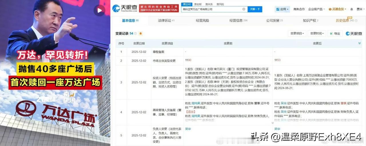 快讯 万达集团首次赎回一座万达广场 看近日王撕葱屡屡被拍,还上了热搜,难道王家要咸鱼翻身了? 据天眼查工商信息显示,12月2日,烟台芝罘万达广场(注册资本:7.08亿)发生工商变更,新华保险旗下两家公司退出股东行列,新增的万达商管旗下上海万达锐驰为唯一全资控股股东。 王健林不愧为当过兵的,70多岁的年龄太有韧性了,眼见万达集团在他的努力下有了新的曙光。 不过也有人分析,万达2025年光累计被执行金额就超53亿元,此时赎回可能与区域运营价值重估、资产重组或债务谈判相关。 无论如何,我也不希望万达快速倒台,因为慢点尽量软着陆,老白姓及下面的供应商、小本生意等也能有个缓冲的时间段。 您觉得呢?