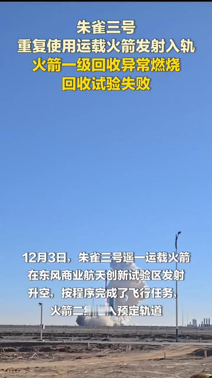朱雀三号重复使用运载火箭发射入轨,火箭一级回收异常燃烧,回收试验失败。 12月3日,朱雀三号遥一运载火箭在东风商业航天创新试验区发射升空,按程序完成了飞行任务,火箭二级进入预定轨道。此次任务同时开展了火箭一级回收验证,但过程中发生异常燃烧,未实现在回收场坪的软着陆,回收试验失败,具体原因正在进一步分析排查。