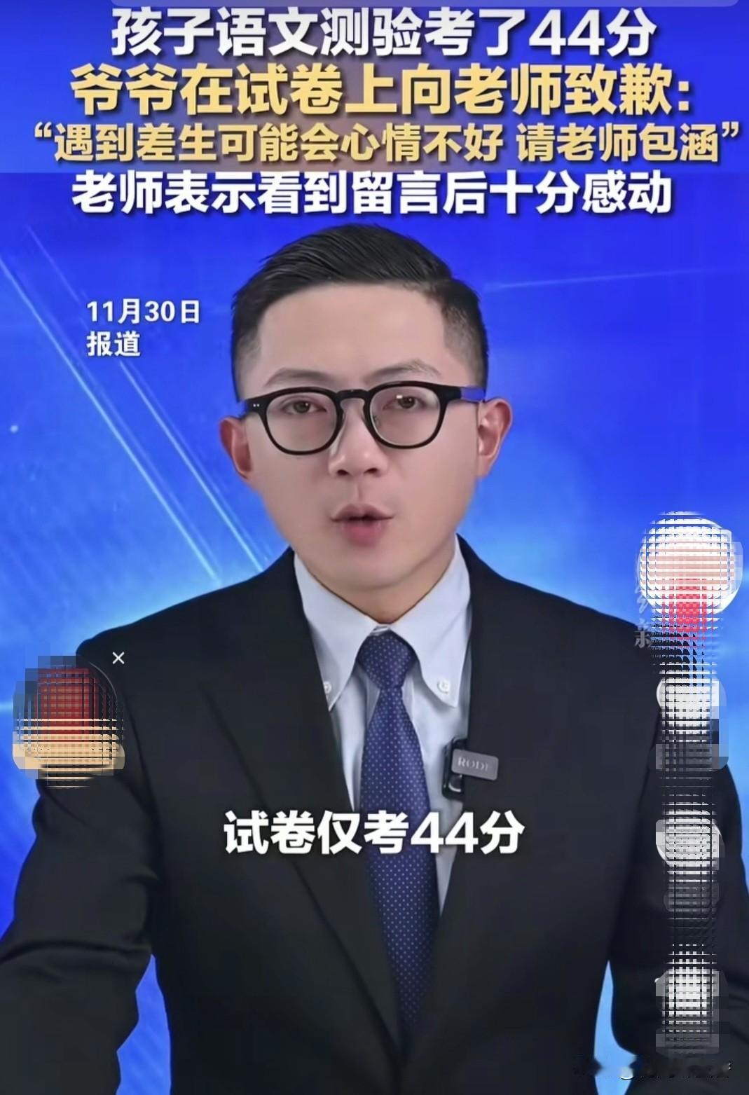 44分试卷+ 爷爷留言冲上热搜! 教育的温度,从不是满分标准答案 湖北宜城一张44分的语文试卷,最近刷爆全网。试卷空白处,留守儿童爷爷的手写留言戳中无数人:“老师您好!遇到差生可能会心情不好,请老师包涵,谢谢!” 这不是简单的道歉,而是隔代教养的无奈与守护。孩子父母常年在外打工,68岁的爷爷文化程度不高,连小学课程都辅导不了,却拼尽全力为孙子“撑场面”——怕老师厌烦、怕孩子被贴“差生”标签,只能用最质朴的文字表达体谅与恳求。 最暖的是邱老师的回应。她没揪着分数说教,反而被这份真诚打动,主动给爷爷打电话安抚,每天抽20分钟帮孩子补基础,课堂上多提问多鼓励。如今孩子成绩已提升到62分,这份双向奔赴的善意,远比满分更动人。 ▶️ 网民评说:“爷爷的字里全是爱,44分不是差,是没被辜负的努力!” “这才是家校共育该有的样子,互相体谅比指责有用一万倍” “留守儿童的成长太需要这样的温柔,老师和爷爷都好棒!” 教育的本质从不是分数至上,而是看见每个孩子背后的故事。你怎么看待隔代教养的不易?欢迎评论区聊聊~湖白宜城