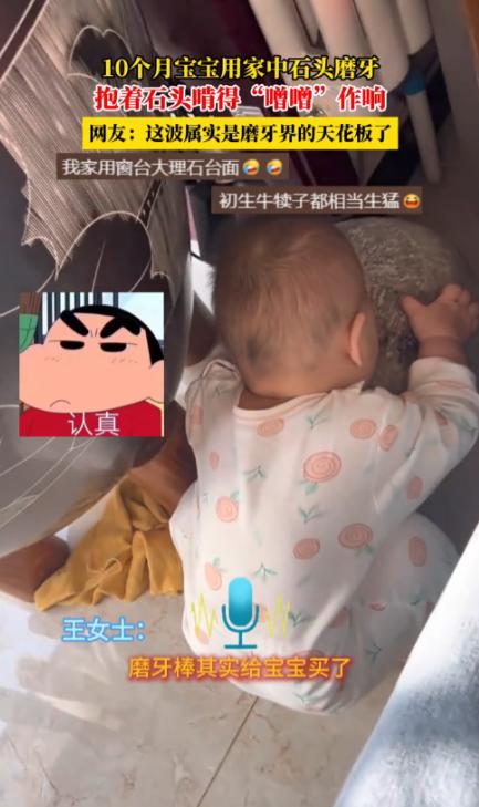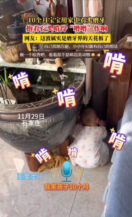 “解释不清了!”11月29日报道,河北石家庄,一女子见宝宝到了磨牙期,就买了些磨牙棒给他,可是宝宝根本不喜欢,偏偏抱着鱼缸旁的石头啃,发出“噌噌”的声音!女子听了都有些害怕。[熊猫] 河北石家庄的王女士拍下了一段让人忍俊不禁的视频,她五个多月大的宝宝,放着崭新的磨牙棒不用,偏偏抱着鱼缸边的一块鹅卵石啃得起劲。 视频里,小家伙双手紧紧环抱那块比拳头还大的石头,小嘴一张一合,发出“咯吱咯吱”的声响,王女士说,第一次听到这声音时,她整个人都紧张起来,生怕孩子磕到牙龈或者误吞碎屑。 宝宝大约在四到六个月时开始萌牙,牙龈会又痒又胀,这种不适感驱使他们本能地寻找东西啃咬来缓解,王女士早就做好了准备,网购了三款不同材质的磨牙棒,有硅胶的、木质的,还有可以冷藏的果蔬款。 结果呢?宝宝对这些精心挑选的磨牙工具统统不买账,咬两下就扔到一边,反倒是那块被遗忘在角落的鹅卵石,成了他的心头好。 王女士试过好几次把石头藏起来,每次石头一消失,小家伙就开始到处找,找到后立刻抱住继续啃,那认真的小表情仿佛在说“这才是正经磨牙的东西”。 担心安全问题,王女士专门带孩子去看了儿科医生,医生检查后说,口腔没有划伤,牙龈发育正常,不过医生也提醒,石头表面可能有细菌,而且质地太硬,长期啃咬确实存在磨损乳牙的风险。 医生给出的建议是:可以把石头彻底清洗消毒后,在家长全程看护下让孩子短暂接触,同时准备一些替代品慢慢转移注意力,比如冰镇过的牙胶,凉凉的触感对肿胀的牙龈有舒缓作用,很多宝宝都挺喜欢。 后来王女士想了个折中的办法,她买了几块专门给婴幼儿玩的光滑木质积木,形状圆润没有棱角,又有一定硬度,宝宝试了试,虽然还是时不时惦记那块石头,但至少愿意拿积木磨牙了。 王女士说,经历了这件事她最大的感受是,当妈的操碎了心准备的东西,孩子不一定领情,但换个角度想,这也说明小家伙有自己的判断和喜好,作为家长能做的就是把关安全,其他的慢慢引导就好。 现在那块鹅卵石已经被王女士收起来了,不过她特意拍照留念,她说等孩子长大了给他看,让他知道自己小时候有多“硬核”。 看了石家庄这位宝宝放着磨牙棒不啃,偏偏钟情于石头的趣事,不少网友被宝宝的“硬核”选择逗笑,纷纷留言调侃。 有人说:“这娃从小就知道啥是纯天然、无添加,这眼光毒辣!” 还有人打趣道:“磨牙棒是厂商设计的,石头是大自然设计的,明显宝宝更信任后者的品质。” 更有网友幽默地表示担忧:“宝宝这是提前进入‘石器时代’了吗?可得看好了,下次别抱着金砖啃,那咱可啃不起。”   一位宝妈分享道:“我家那个也是,买的牙胶看都不看,就喜欢啃婴儿床的木头栏杆,那小牙印到现在还留着呢,算是成长纪念了。” 另一位家长说:“看来娃们的爱好是相通的,我闺女当时最爱的是她姥姥的紫砂壶盖,抱住了就不撒手。” 也有细心的网友提醒道:“笑归笑,家长可得千万小心,石头太硬了,可别硌坏了刚长出来的小牙,或者不小心磕到嘴巴。” 另一位网友建议:“是不是可以找些材质安全、硬度类似的替代品,比如那种食品级的硅胶玩具,既满足了孩子想啃硬物的感觉,又能保证安全。” 那么对于这件事情,您有什么想说的呢? 信息来源:日照日报