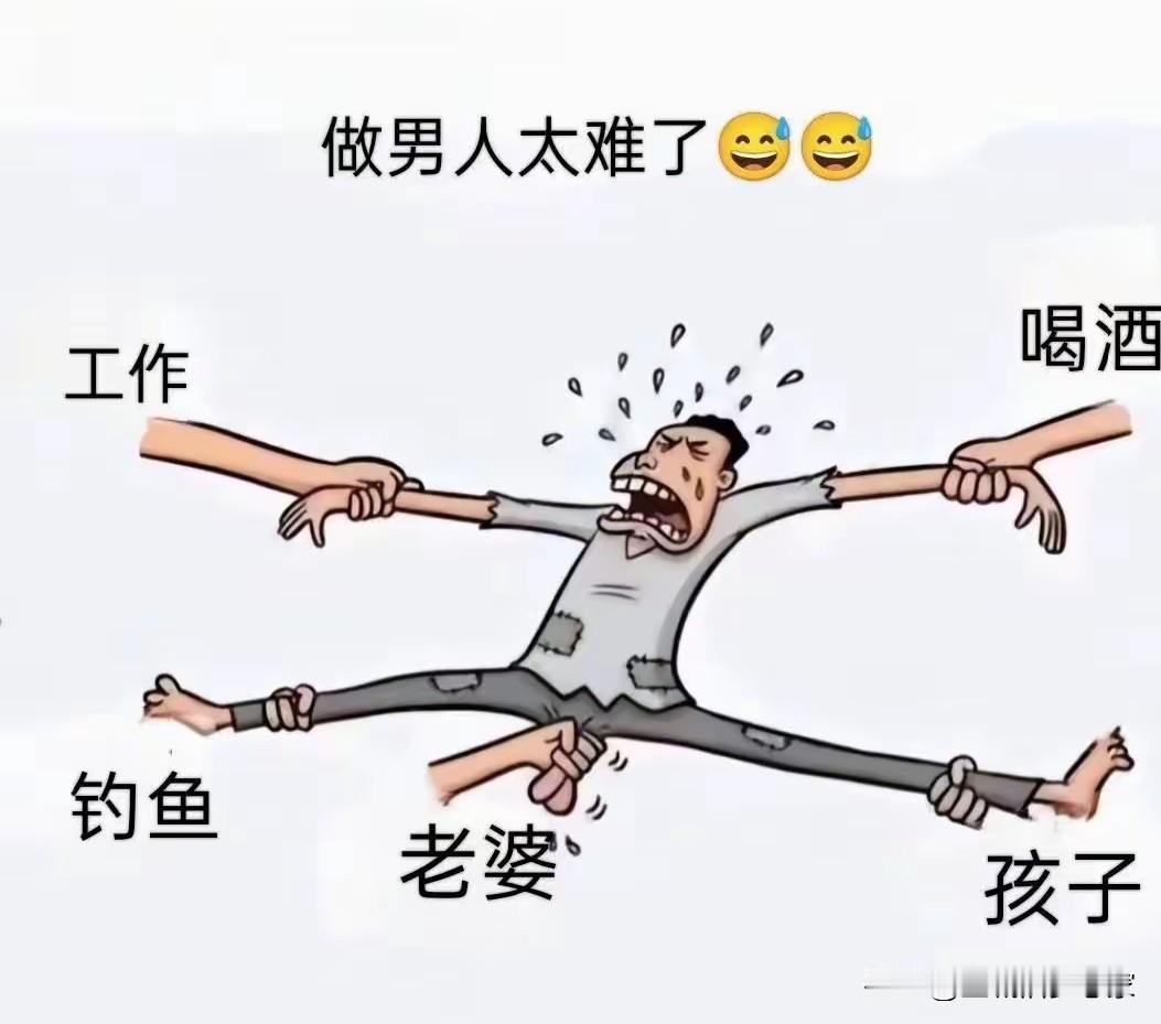 当代男人的“五马分尸”日常,谁看了不说句真实! 这张图精准戳中了多少兄弟的痛点? 左手是工作催命,右手是酒局难推, 左腿拴着钓鱼的瘾,右腿绑着娃的哭闹, 中间还被老婆的念叨拽着裤腰 感觉每天都在“要我陪娃”“要我加班”“要我喝酒”“想去钓鱼”里极限拉扯, 最后活生生把自己劈成了八瓣,主打一个身心俱疲😂 ——谁不是一边喊“做男人太难”,一边咬着牙把生活这团线理顺呢?