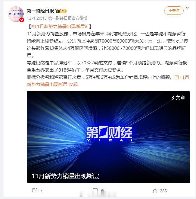 11月新势力销量出现断层 不得不说还是媒体会写一些,什么叫销量出现断层新能源汽车汽场全开