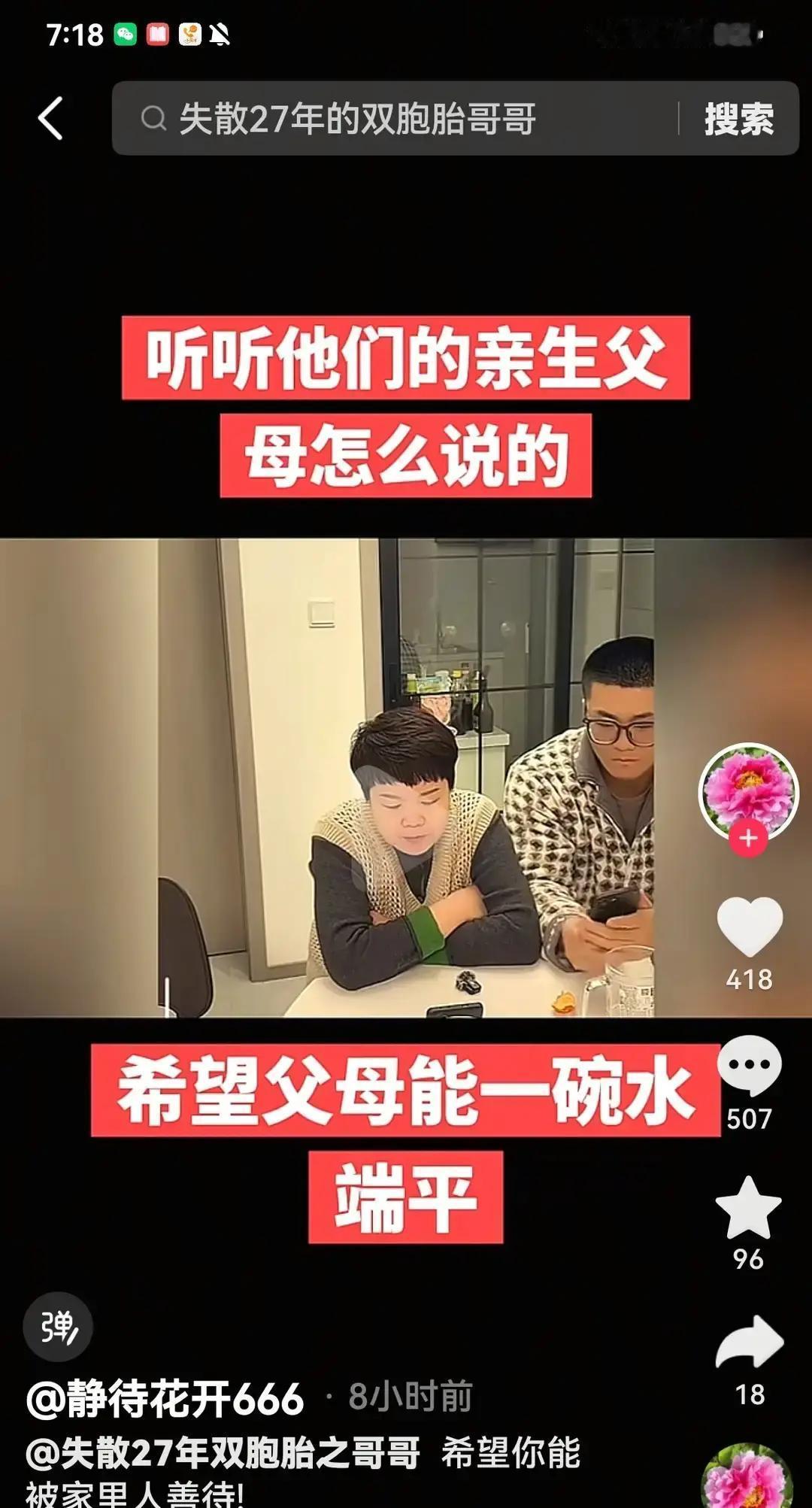 昨晚弟弟直播道歉,爸妈隔空喊话求大儿子回家,满屏弹幕却都在骂“偏心”“剧本”——这场27年后再重逢的双胞胎大戏,越来越像狗血连续剧了。 有网友扒出细节:弟弟道歉时眼神飘忽,妈妈提到“家里三套房”时突然哽咽,而哥哥默默删光了抖音里所有和父母的合照。更扎心的是哥哥同事的爆料:“他从小被养家当顶梁柱,连生病都不敢请假,现在全网却逼他当圣人。” 看着哥哥主页“失散27年”的ID,突然觉得讽刺。流量狂欢里,网友一边喊“千万别心软”,一边熬夜蹲守后续直播;父母一边流泪认亲,一边被扒出早年采访说“送走孩子是为他好”。 最该被听见的当事人,反而成了最沉默的那个。你们觉得,当镜头关闭后,这场亲情与流量的拉锯战里,谁才是真正被困住的人?