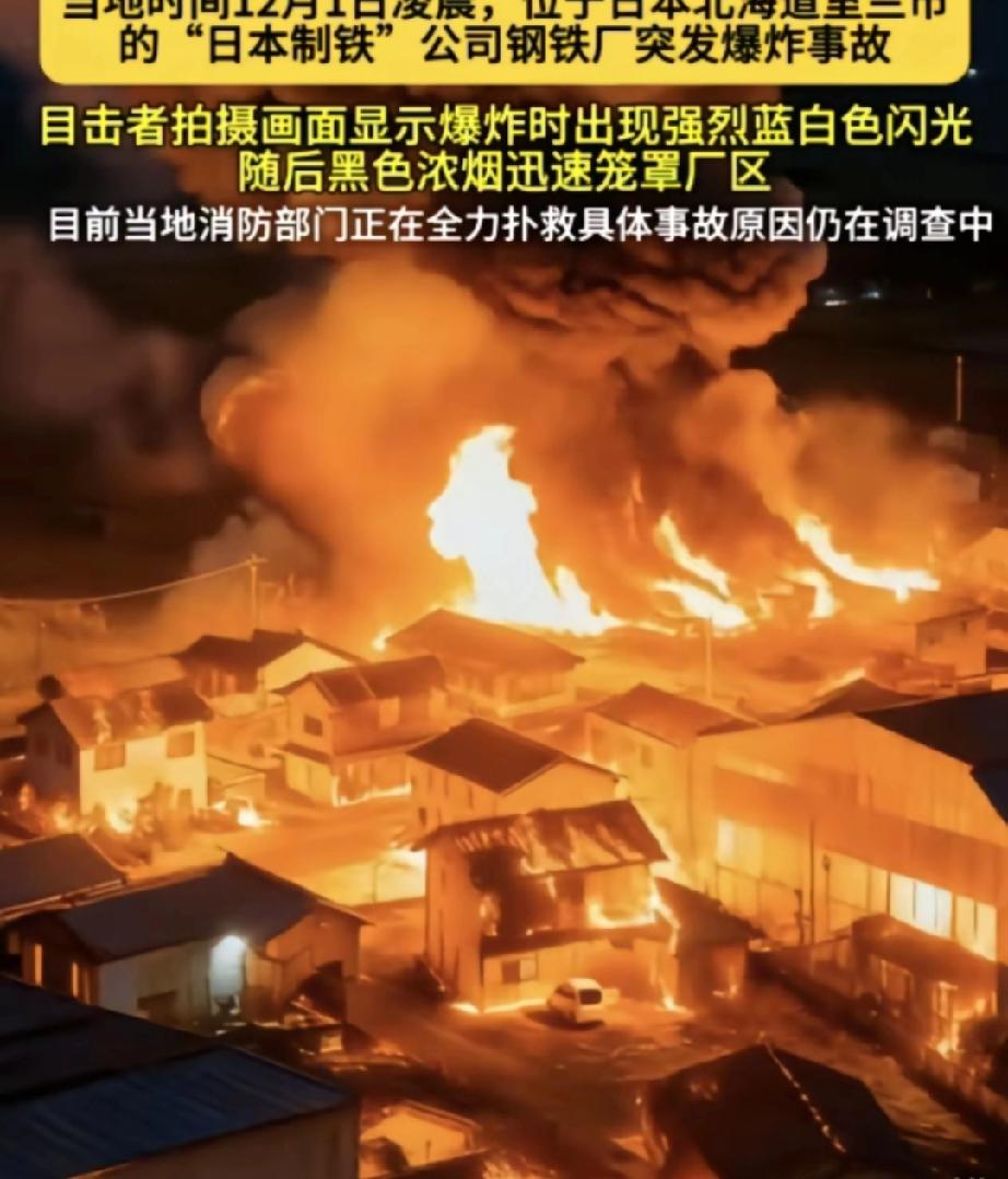 出大事了, 日本钢铁被炸了, 高市要下台了, 商界要求访华 这三件事集中暴露了日本当下的社会、政治与外交困境,相互交织让日本局势更显复杂, 具体详情如下: 1. 日本北海道钢铁厂爆炸,系设备超期未整改所致 :当地时间12月1日凌晨,北海道室兰市日本制铁公司的工厂因热风炉爆炸引发火灾。涉事热风炉2010年建成,超期服役5年,上半年就因压力异常收到整改通知,工厂却为节约成本未落实整改。事故现场混凝土碎片砸毁附近居民车辆,虽无人员死亡报告但有多人受伤,消防部门派46名消防员和14辆消防车处置,后续大火已被扑灭。这也是日本制铁今年发生的第二起同类事故。 2. 高市早苗深陷执政危机,下台风险剧增:高市早苗因发表涉台错误言论引发中日关系紧张,中方采取收紧赴日签证等反制措施,重创日本旅游业、水产业等。这一行为还引发日本内外双重施压,国内方面,多地爆发民众抗议,在野党呼吁其辞职,连原本支持她的自民党大佬麻生太郎也与其切割,其政治献金丑闻还被曝光;外部方面,特朗普不仅与她割裂,还间接否定其挑衅立场,断了她的外部靠山,目前其内阁支持率已跌至不足30%,政坛普遍认为她大概率会被替换。 3. 日本政商界接连请求访华,中方敦促日方反思纠错 :为缓解中日关系紧张带来的冲击,12月相关消息显示,日本跨党派组织“日中友好议员联盟”希望年内派议员团访华,日本经济团体联合会会长筒井义信也请求中方接受其明年1月率经济代表团访华。12月2日外交部发言人林剑回应时,敦促日方撤回高市的错误言论,以实际行动为中日正常交流创造条件。