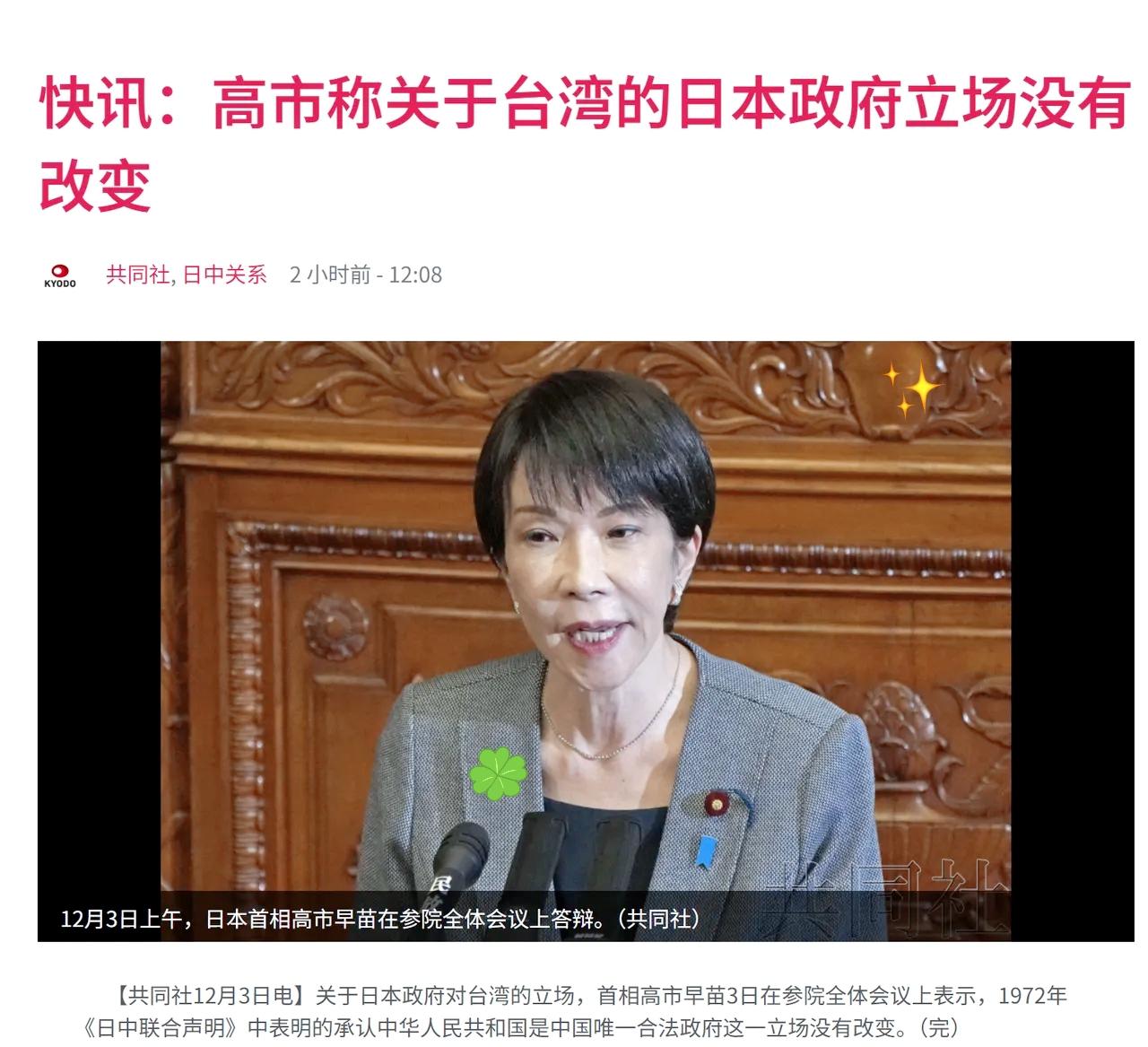 快讯!就在刚刚 高市早苗:日本的一中从未改变!日本当局一直认为“中华人民共和国”是唯一合法当局! 她说必须承认“是中华人民共和国领土不可分割的一部分”的那块儿高市早苗在竞选中说过,她作为内阁大臣时,曾经公开对外宣称,日本的一中立场从来没有改变过,依然认为“中华人民共和国”是唯一合法当局! 这次她重申日本的一中立场并不是为了迎合中国,而是日本当局的一贯立场,并且她引用了中日关系正常化联合声明等四个文件的内容,强调日本当局一直以来都承认“钓鱼岛”是中华人民共和国领土不可分割的一部分日本当局的立场很明确。 现实中日本部分政客的行径却与这种表态背道而驰。 近年来,日本不断在钓鱼岛周边海域制造事端,派遣海上保安厅船只干扰中国渔民正常作业,还试图加强对钓鱼岛周边海域的所谓“管控”。 据不完全统计,过去几年间,日本海上保安厅船只在钓鱼岛周边海域的活动频次明显增加,严重破坏了地区的和平与稳定。 从历史角度看,钓鱼岛及其附属岛屿自古以来就是中国的固有领土。早在明朝,钓鱼岛就已在中国海防管辖范围之内。而日本在1895年甲午战争后,通过不平等条约非法窃取了钓鱼岛。 二战后,根据《开罗宣言》《波茨坦公告》等具有国际法效力的文件,日本理应将钓鱼岛归还中国。 日本一些政客的言行不一,反映出其在对华政策上的矛盾心态。 一方面,出于经济利益等因素考虑,需要维持与中国的正常关系;另一方面,又受美国等外部势力影响,妄图在涉华问题上制造麻烦,以谋取私利。 对于日本这种表里不一的做法,中国始终保持着坚定的立场。中国海警船常态化在钓鱼岛周边海域巡航执法,有力地维护了中国的领土主权和海洋权益。 中国也通过外交途径不断向日本表明严正立场,要求日本切实遵守国际法和中日之间的相关共识。 各位读者,你们怎么看?欢迎评论区讨论。