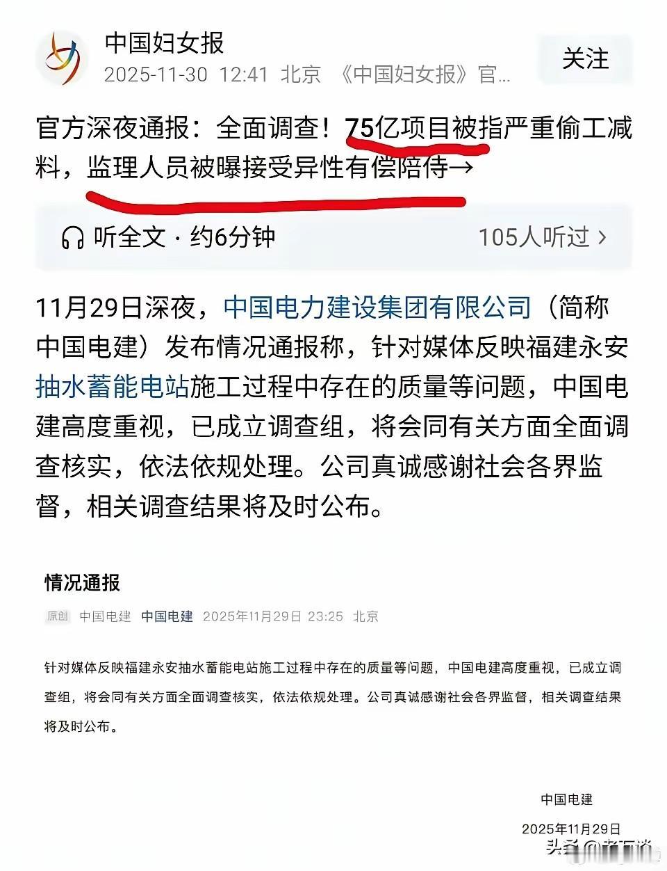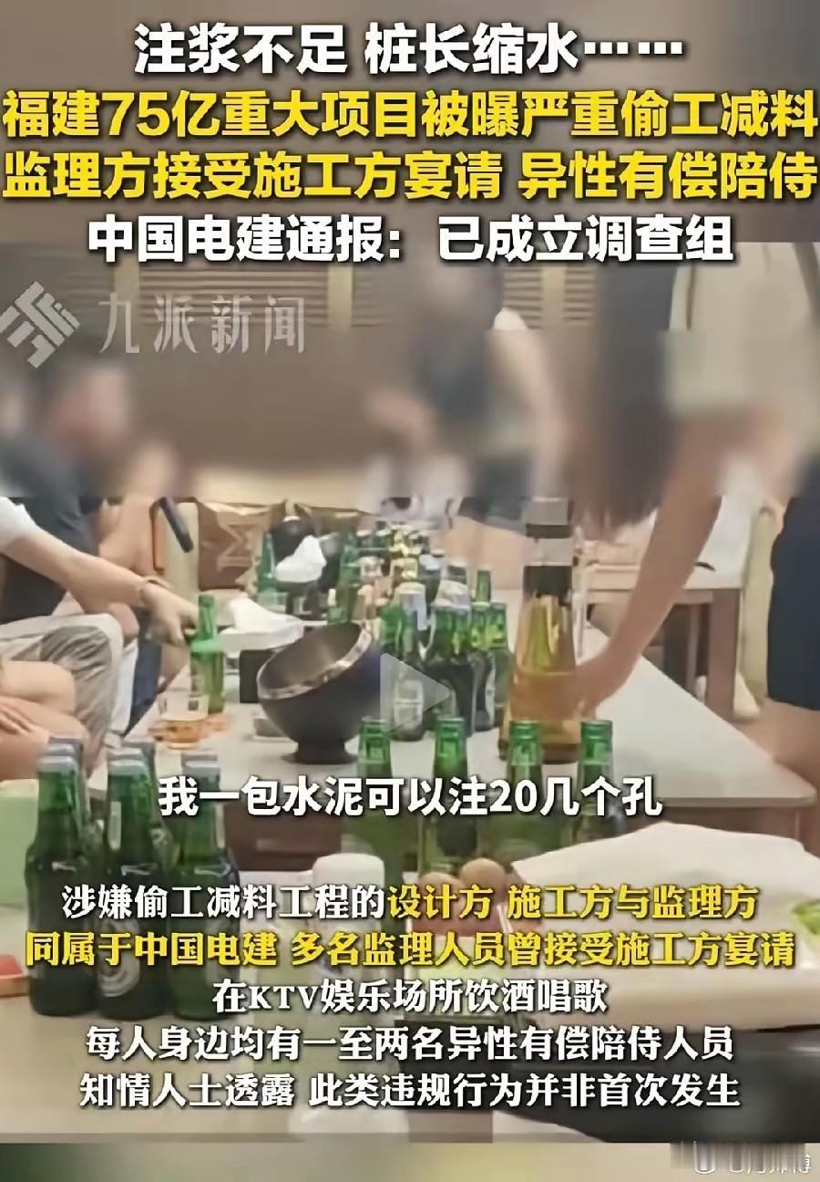 福建投资75亿的项目被爆严重偷工减料 永安抽水蓄能电站被曝光存在很大的问题,这可是关系当地民生的重大民生工程,想不到连这样的工程,这些人都敢造假,太让人吃惊了,真是不要命了。更让人吃惊的是,本来应该起到监督工程的监理,竟然接受施工方的宴请,而且还接受异性有偿陪侍。那个画面都不敢想象,让人不得不怀疑,施工方与监理方存在利益勾连和存在不法行为!官方已经发布通告,已经成立调查组,对该工程涉及的贪污腐化问题将进行全面彻底的调查,并将及时对外公布调查和处理结果。对于其中涉及的违法乱纪行为,将严格依照法律规定追究相关人员的行政责任,甚至移送公安追究其刑事责任。毕竟这件事影响实在太大了,希望通过这次调查,能够彻查其中涉及的猫腻,能够彻底的扫除其中的黑暗。朗朗乾坤,怎能任由这些人捣坏我们的根基。