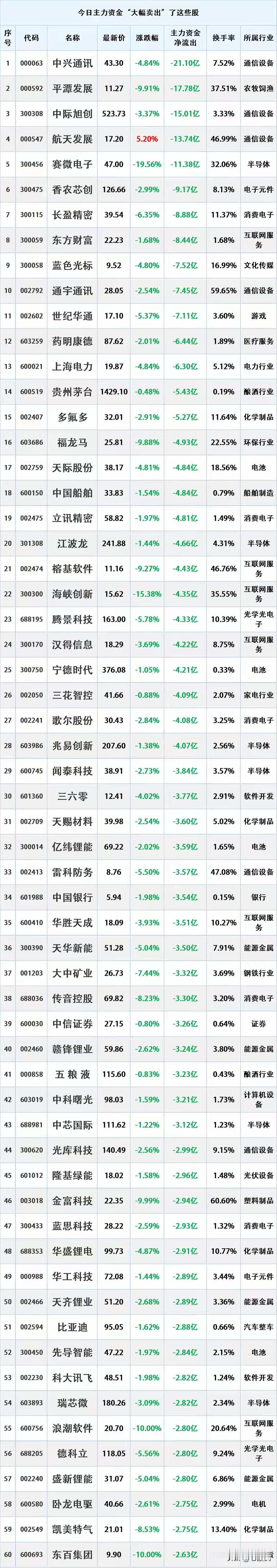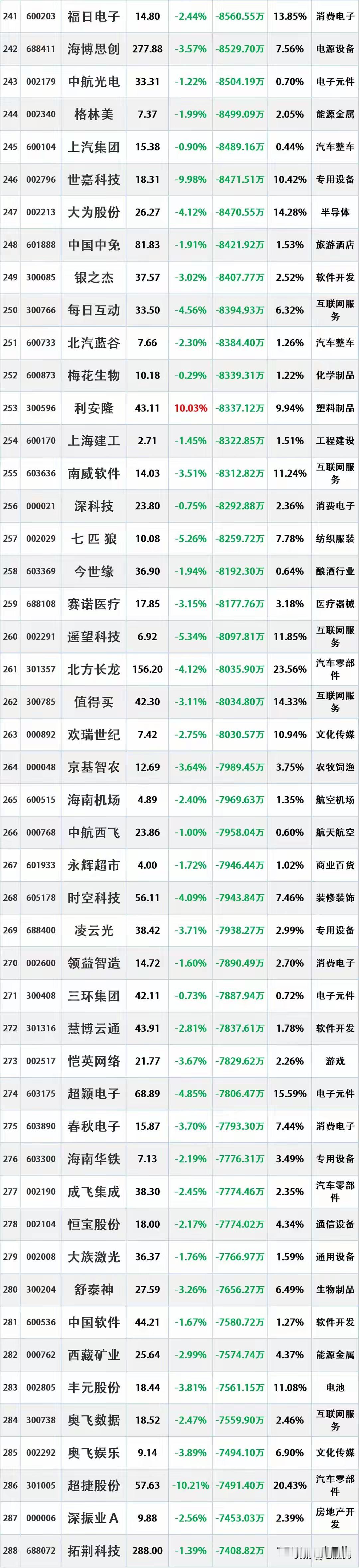 尾盘资金出逃,12月3日主力资金大幅流出的股票名单。 资金流出是指在一定时期内(如一天、一周等),主动卖出某只股票的资金量大于主动买入该股票的资金量。主动卖出是指投资者以买方的报价直接成交,显示出投资者对该股票的消极持有或抛售意愿。