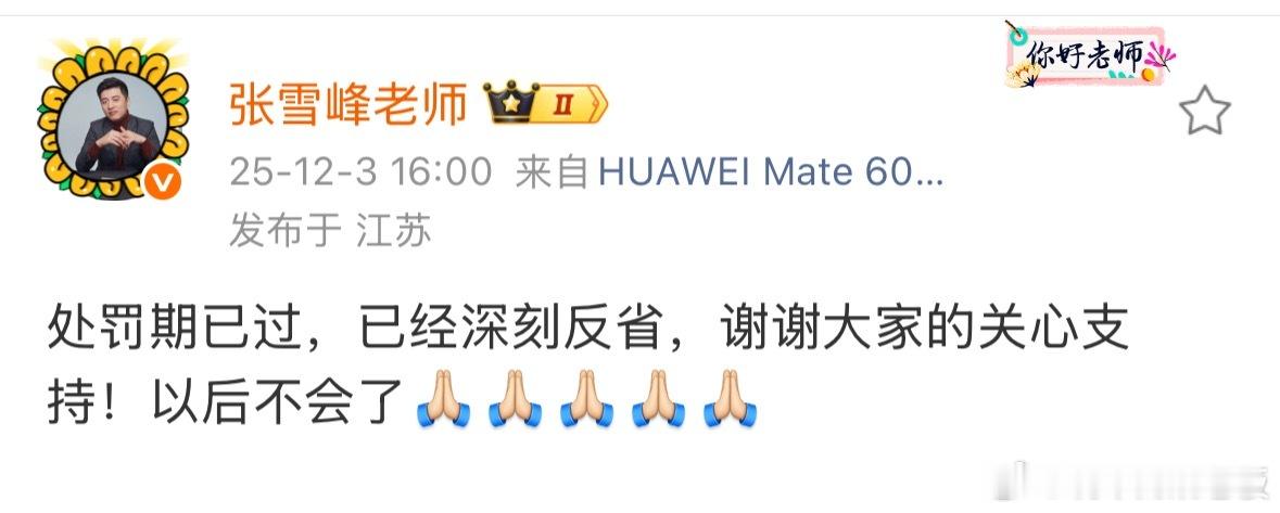 张雪峰称已经深刻反省刚刷到张雪峰发博:“处罚期已过,已深刻反省,谢谢关心支持!以后不会了”。之前的事确实不对,公众人物应该注意自己的言行举止,但能认错+保证,也算给关心他的人一个交代了。