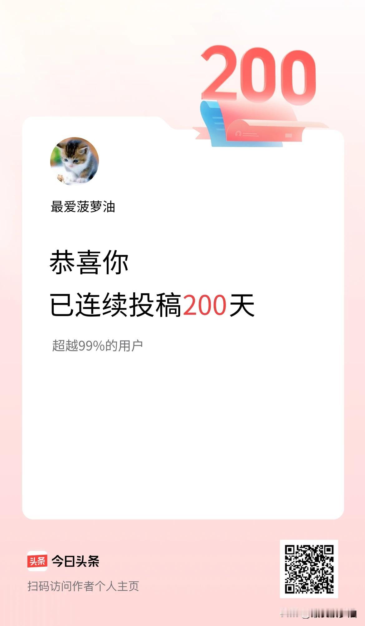 泼天的富贵来了~恭喜你!已连续投稿200天!超越99%的用户! 今天浏览头条时,突然弹出消息提示:“恭喜你!已连续投稿200天!超越99%的用户!” 这是泼天的富贵来了吗?头条总算想起我了,给我颁发了一个“连续投稿200天”的证书。 弱弱的问一句:“只给证书,不给点实质的奖励吗?比如奖金?比如流量包?” 就算牛马人月全勤奖金都有几百,最少也有几十吧?什么都没有只给一个证书,这个奖励有点弱了,跟画大饼似的! 实际上我连续投稿何止200天啊!应该有两年多的时间每天都在投稿,没有间断过。 冲着自己这份干劲就应该给自己加个鸡腿!头条的奖励是指望不了一点的,只给了我一个大饼! 转念一想,算了!这个饼我咽下去吧!总比什么都没有好啊!起码它让我有了发微头条的素材,也算是这个饼的光荣任务了! [捂脸][我想静静][笑哭][强][捂脸][我想静静][强][笑哭]