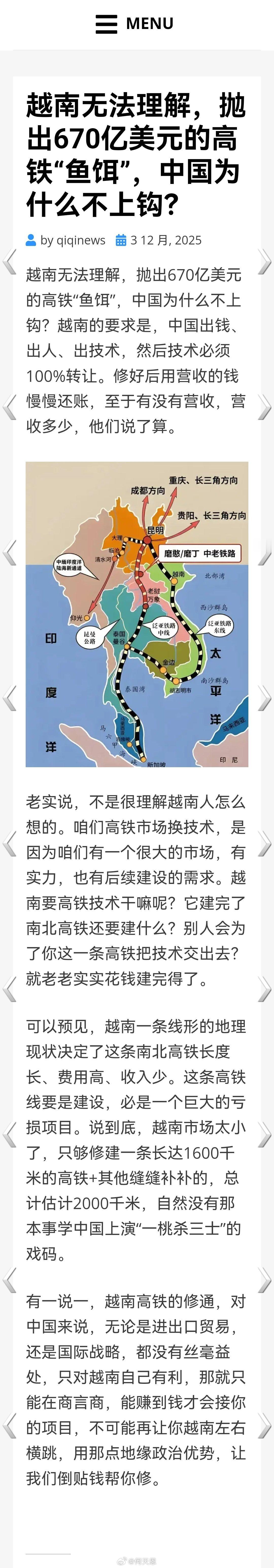 越南无法理解,抛出670亿美元的高铁“鱼饵”,中国为什么不上钩?海外新鲜事何天
