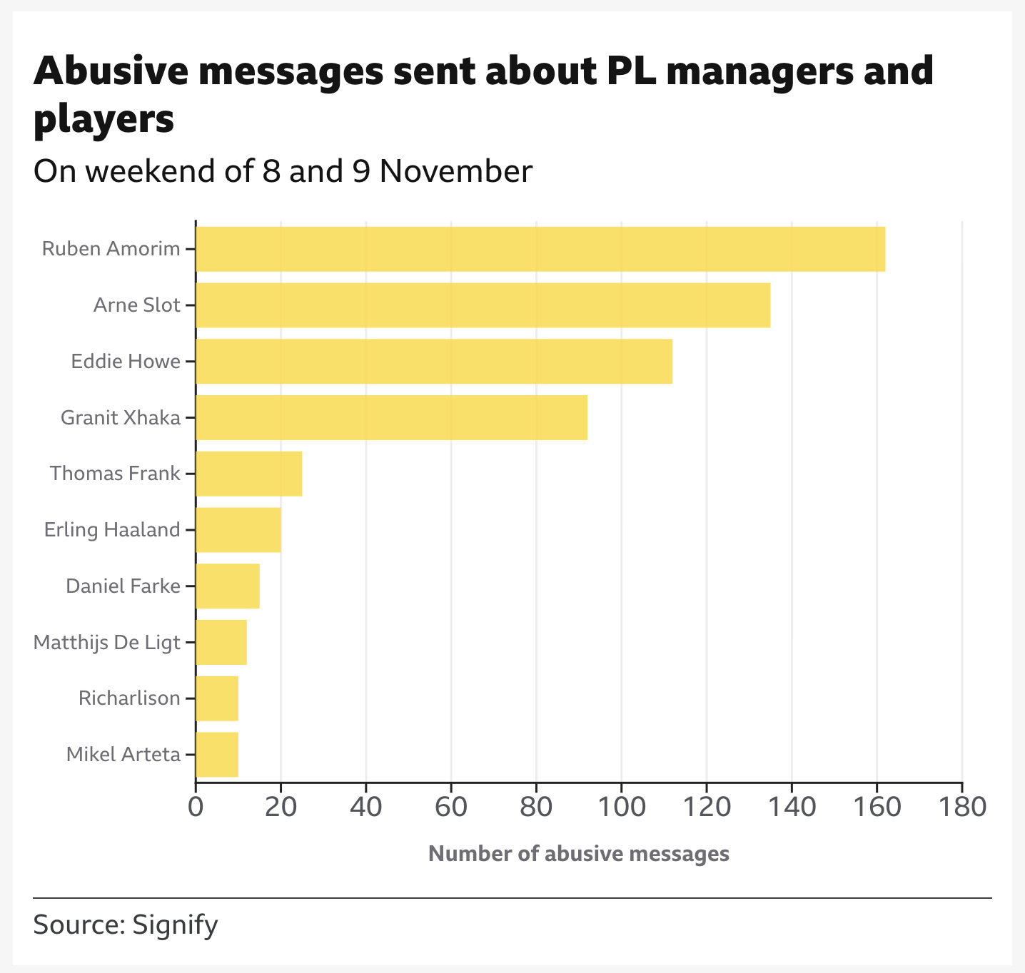 英超曼联 阿莫林在英国的足球口碑如何,看起来不太行。当然有人说网上喷子多,不过起码在网络世界,阿莫林的口碑和战绩还是相对成正比的。这还是极端言论,并不包含语气相对平和的批评。BBC 与数据公司 Signify 的调查显示,在 11 月 8–9 日的英超比赛周末,社交媒体共出现 超过 2,000 条极端辱骂,包括:死亡威胁/强奸威胁/种族主义言论/恐同内容/暴力威胁数据来自对超过 50 万条 X、Instagram、Facebook、TikTok 帖子的扫描。其中教练比球员更容易成为攻击对象,在英超中,收到辱骂最多的主帅包括:鲁本·阿莫林(曼联)阿尔内·斯洛特(利物浦)埃迪·豪(纽卡斯尔)其中 82% 的辱骂来自 X(美国微博)所有辱骂信息中有61% 来自英国和爱尔兰共和国,热刺 vs 曼联 2-2 战平是辱骂高峰。这场比赛包含补时阶段两个进球,引发网友情绪爆发,成为辱骂密集时段,两队主教练(尤其是阿莫林)成为主要攻击目标,多名球员也受到集中辱骂。最后,我反对网暴,大家要喷阿莫林还是控制下情绪