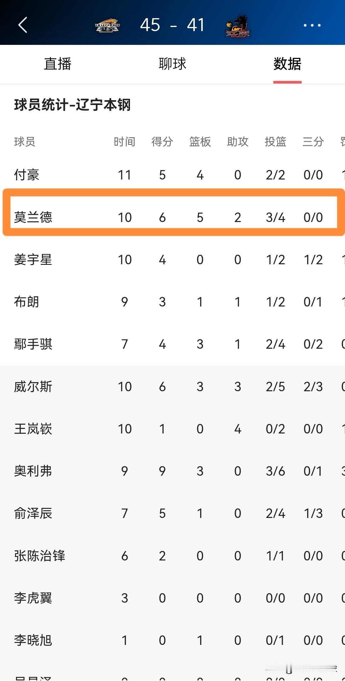 辽宁本钢老将莫兰德真是宝刀不老!在今天进行的辽宁本钢和江苏肯帝亚的CBA杯赛中,目前双方半场战罢,辽宁本钢以45:41领先对手。值得一提的是,在前两节比赛中,33岁的莫兰德首发出战10分钟,投篮4中3非常高效的得到6分5篮板2助攻1抢断2盖帽,他的场上正负值为+8。 如果莫兰德能够在下半场比赛中保持这样的出色表现,那么辽宁本钢一定会赢下本场比赛,取得新赛季的开门红。