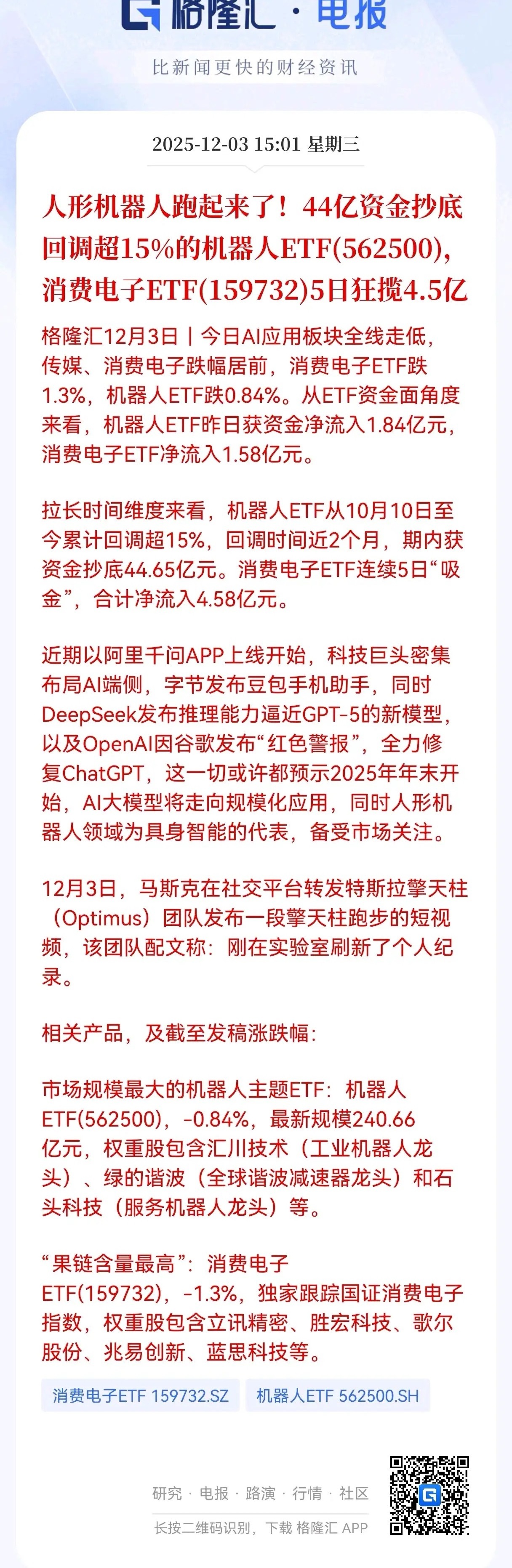 重大利好!人形机器人跑起来了!资金提前嗅到变革的气息?44亿资金抄底回调超15%的机器人ETF(562500),消费电子ETF(159732)5日狂揽4.5亿。 当马斯克旗下特斯拉Optimus团队发布人形机器人跑步视频,刷新实验室个人纪录的那一刻,资本市场已提前嗅到变革的气息。格隆汇电报数据显示,2025年12月3日,机器人ETF(562500)获1.84亿元资金净流入,而消费电子ETF(159732)亦录得1.58亿元资金加仓,科技赛道暗流涌动。这场投资热潮并非偶然。拉长时间线,机器人ETF自10月10日以来累计回调超15%,近两个月内吸引44.65亿元抄底资金;消费电子ETF则连续5日吸金,合计净流入4.58亿元。两大科技主线同步崛起,背后是AI产业化落地的清晰信号。从字节跳动推出豆包手机助手,到DeepSeek发布推理能力逼近GPT-5的新模型,再到OpenAI因谷歌“红色警报”全力修复ChatGPT,科技巨头正密集布局AI终端侧,预示2025年末将迎来AI大模型规模化应用拐点。作为科技赛道的具身智能代表,人形机器人成为资金聚焦的核心。市场规模最大的机器人ETF(562500)权重股涵盖工业机器人龙头汇川技术、全球谐波减速器龙头绿的谐波及服务机器人龙头石头科技,形成全产业链布局。消费电子ET(159732)则于“果链含量最高”著称,重仓立讯精密、胜宏科技等消费电子供应链龙头,同步受益于AI硬件创新周期。当前,AI应用板块调整已近尾声,44亿资金抄底机器人ETF的举动,彰显机构对科技赛道长期价值的共识。随着人形机器人技术突破与消费电子创新周期共振,科技投资正迎来具身智能与AI终端的双重驱动时代