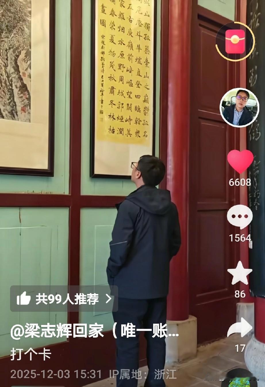 梁志辉又更新视频了, 他只更新了一个背景视频, 不知道梁志辉是咋想的,是不是也想走直播带货这条路呢,要不怎么这几天天天更新视频呢? 有网友发现,他ip地址到浙江了,他明天大概会空降他爸的直播间,看他面相也比较重感情善良的一个大男孩, 但是首页的ip地址是广东。 网友们猜一猜明天梁志辉会空降他爸的直播间吗?