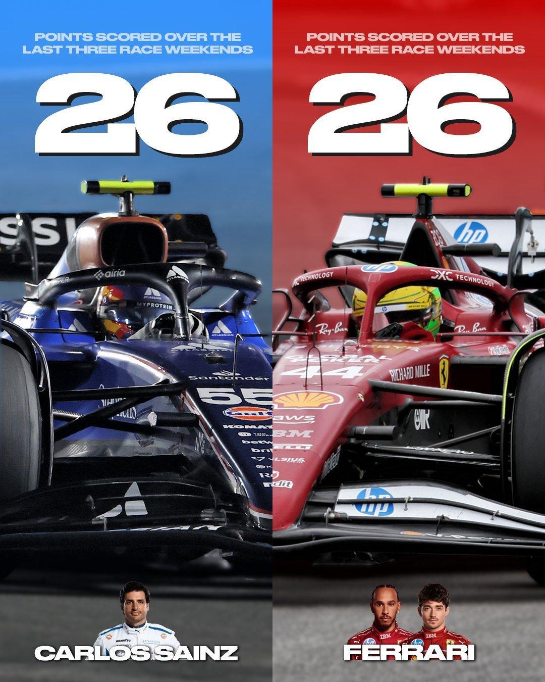 前法拉利车手塞恩斯过去三站比赛的得分,是两位现法拉利车手过去3站的总和。2025f1阿布扎比大奖赛