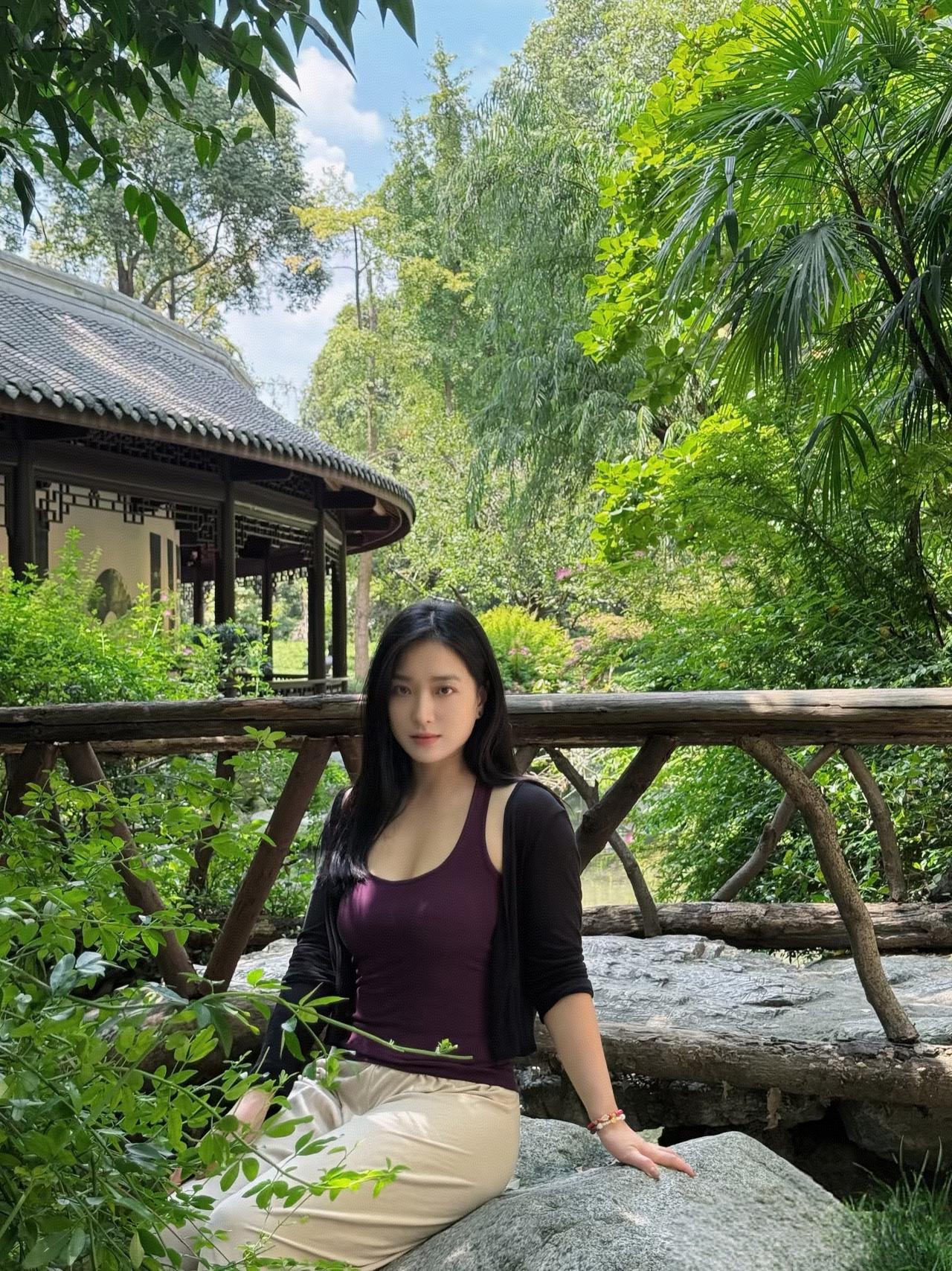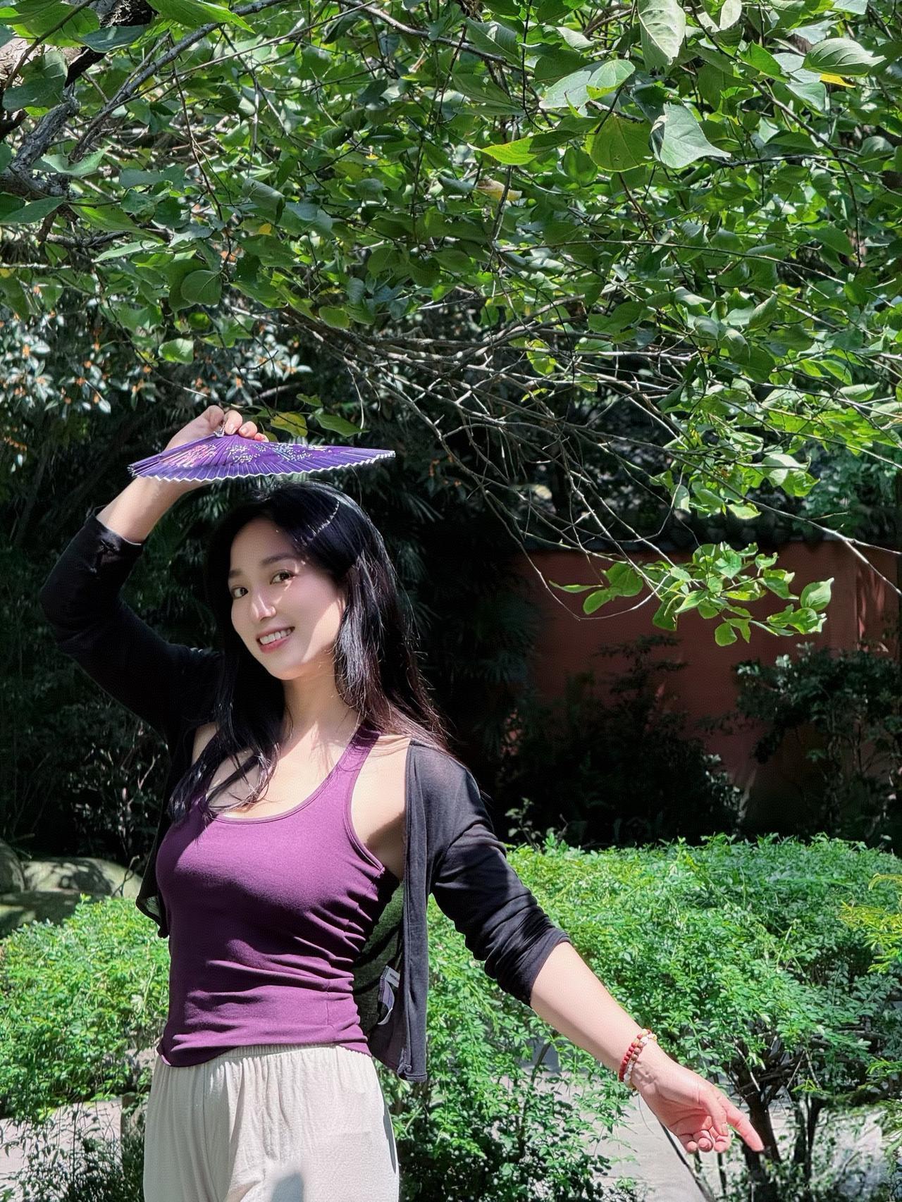 躲进园林的绿意里,紫吊带裹着夏意,黑开衫松松垮垮,素色裤脚蹭着青苔凉。举把紫扇遮碎光,身后亭台浸在荷香里,古树弯成天然靠椅。风裹着叶响掠过耳尖,把日常的闷热,都揉成这帧松弛又明艳的画面。 在园林的绿意里偷闲,紫衫配素裤,折扇遮半缕阳光,连风都沾了江南的软。古树、亭台、荷池做背景板,把日子过成帧帧松弛感大片~