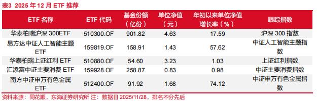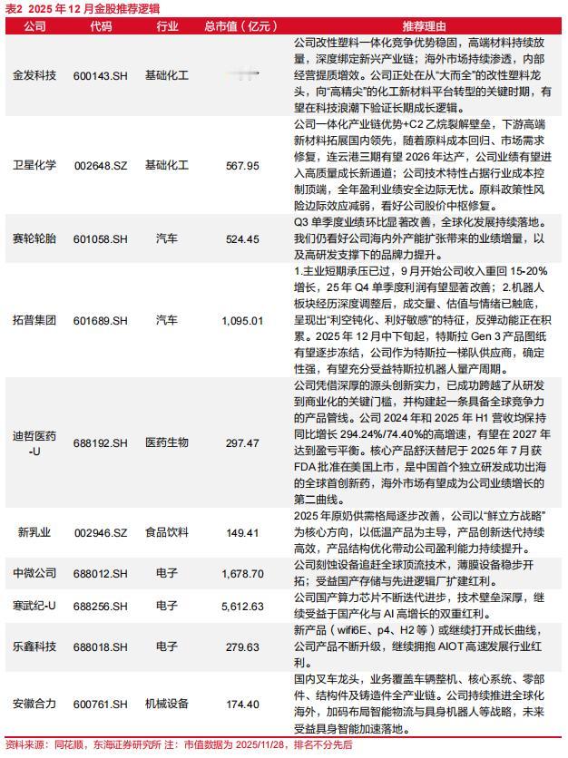 12月券商金股组合(2) 各家券商每月初对外披露的十大金股,高度汇集了分析师的研究精华,融合了风格选择、行业配置、选股择时等多维度的研究观点,长期以来受到市场的热烈关注。12月争取多给大家分享几篇,作为大家资产配置的参考,今天带来第二篇-东海证券12月金股。 除了可以参考分享图片中的具体标的和推荐逻辑外,东海证券在报告中的策略部分认为,短期市场扰动有望减弱,美联储降息预期波动及经济数据影响仍在,但流动性宽松环境未变。国内消费相对稳定,投资增速承压,出口保持韧性。配置上建议关注:1.均衡配置,把握扩内需、反内卷与科技赋能主线;2.日历效应下,大市值风格占优,可关注沪深300、红利相关标的;3.继续看好科技板块,尤其是芯片与半导体行业。整体策略在外部压力缓解、内部政策积极的背景下,侧重结构性与防御性布局。