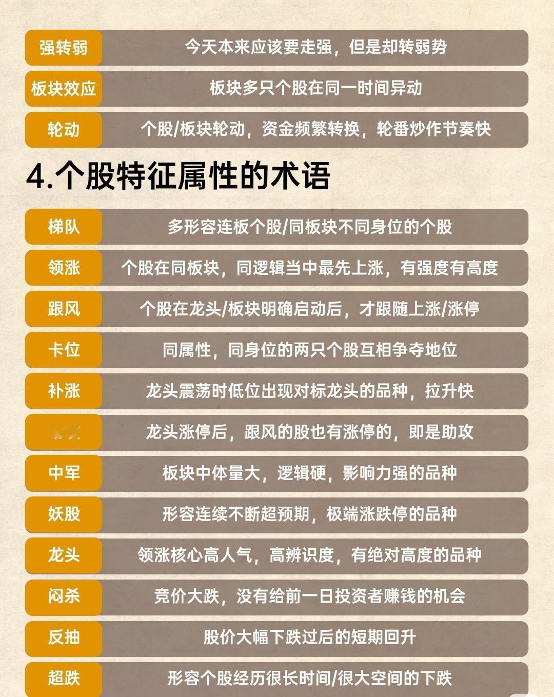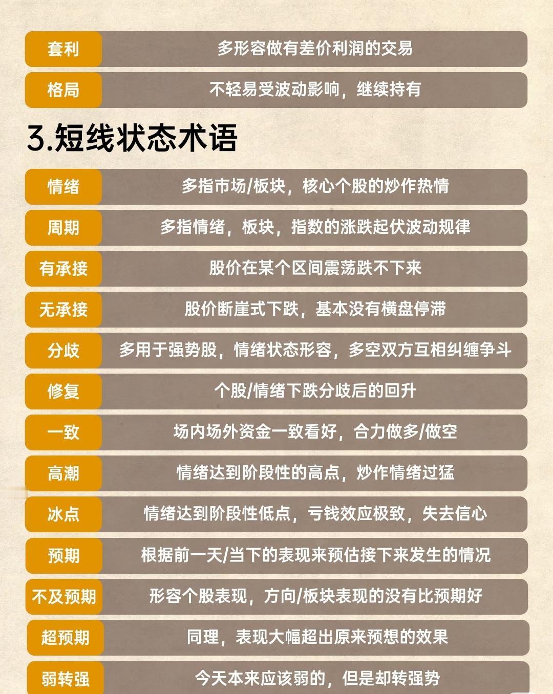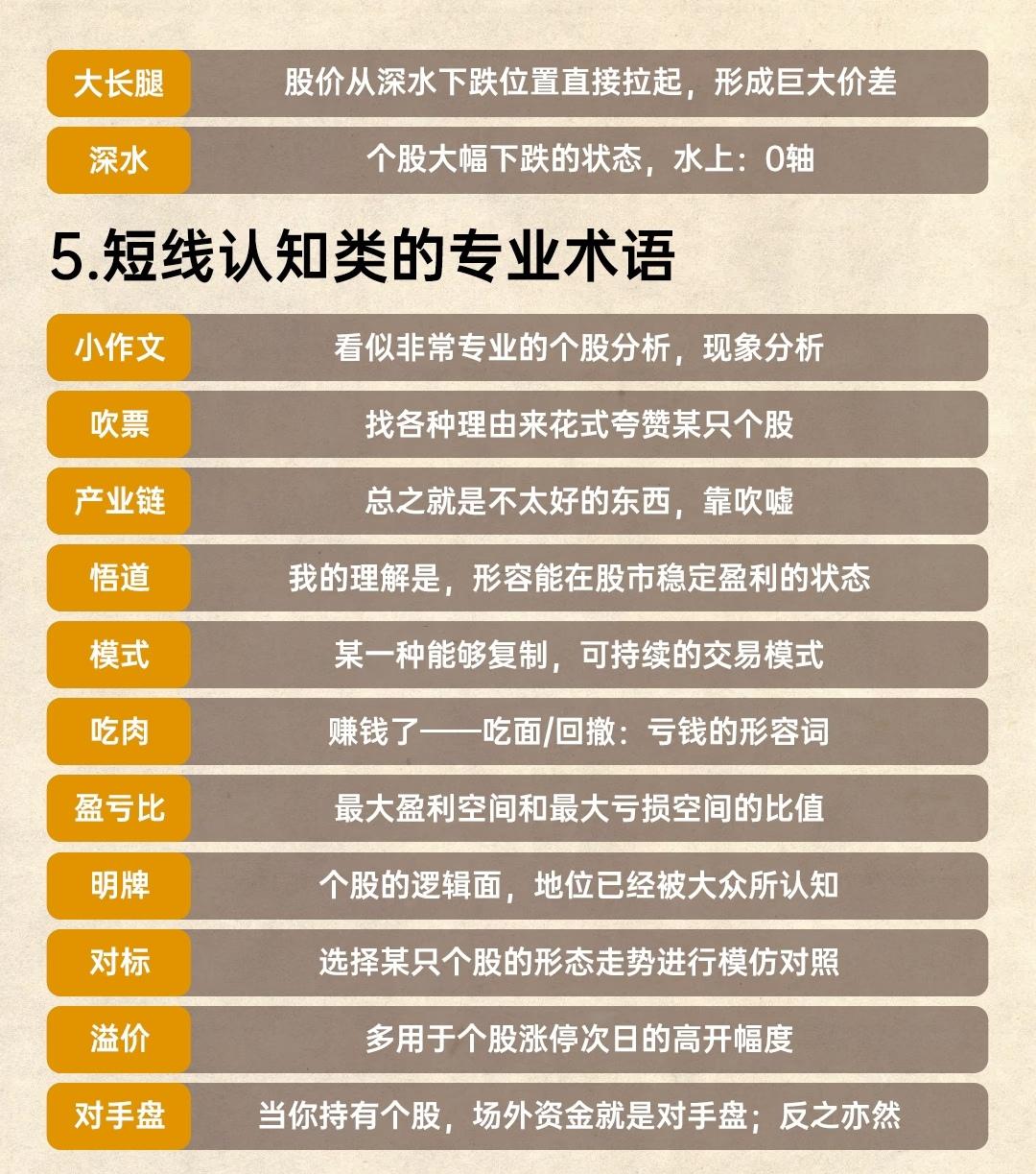 梳理了短线炒股常用的71个专业术语,涵盖涨停板相关、交易操作、市场状态、个股特征及认知类五大类别,帮助理解短线交易的核心概念: 一、涨停板名词专用术语:围绕股价涨停的不同形态与特征展开,包括涨停板(当日达最高限价)、一字板(开盘即封板未打开)、烂板(涨停多次打开但收盘仍封板)、秒板(开盘极速冲板)、换手板(量能与前日持平或放大)、缩量板(量能缩小)、地天板(从跌停拉至涨停)、天地板(从涨停跌至跌停)、炸板(涨停后回落)、连板(连续涨停)、首板(前日未涨停今日涨停)、反包板(前日涨停、昨日未涨停、今日再涨停)、空间板(当日连板高度最高的个股)等,聚焦涨停过程中的典型表现。 二、短线交易操作的术语:描述具体的买卖策略与动作,如首阴(龙头连板后断板的当日)、打板(涨停价买入)、扫板(接近涨停时提前挂涨停价买入)、排板(封板后挂涨停价排队)、打回封(炸板修复后再封板时买入)、接力(连板或龙头上涨过程中买入)、半路(大幅拉升时博弈涨停)、点火(大单低位买入吸引跟风)、低吸(低位或下跌分时买入)、核按钮(不计代价挂跌停卖出)、冲天炮(不计代价挂涨停买入)、反核(低吸核按钮抛出的筹码)、板砸(涨停价卖出)、翘板(跌停价买入)、割肉(亏损卖出)等,覆盖从追涨到止损的全流程操作。 三、短线状态术语:反映市场或个股的情绪与周期变化,包括格局(不受波动影响继续持有)、情绪(市场/板块/核心股的炒作热情)、周期(情绪、板块、指数的涨跌规律)、有承接(股价区间震荡难下跌)、无承接(断崖式下跌无横盘)、分歧(多空纠缠)、修复(下跌后回升)、一致(资金合力看多/空)、高潮(情绪阶段性高点)、冰点(情绪阶段性低点)、预期(对后续表现的预估)、不及预期(表现未达预期)、超预期(表现远超预想)、弱转强(本应弱势却转强)等,用于判断市场强弱与转折点。 四、个股特征属性的术语:刻画个股在板块或行情中的角色与表现,如梯队(连板或同板块不同身位个股)、领涨(同板块中最先上涨且有强度)、跟风(龙头启动后跟随上涨)、卡位(同属性个股争夺地位)、补涨(龙头震荡时低位快速拉升的对标股)、助攻(龙头涨停后跟风也涨停)、中军(体量大、逻辑硬的板块核心)、妖股(连续超预期、极端涨跌的品种)、龙头(高人气、高辨识度的领涨核心)、闷杀(竞价大跌无获利机会)、反抽(大跌后短期回升)、超跌(长期或大幅下跌的个股)等,明确个股在市场中的定位。 五、短线认知类的专业术语:涉及交易认知与市场现象的描述,包括大长腿(从深水区拉起形成大价差)、深水(大幅下跌状态,0轴以上称“水上”)、小作文(看似专业的分析)、吹票(花式夸赞个股)、产业链(负面意义的吹嘘行为)、悟道(稳定盈利状态)、模式(可复制的可持续交易方式)、吃肉(赚钱)/吃面(亏钱)、盈亏比(最大盈利与亏损的比值)、明牌(逻辑与地位被广泛认知)、对标(模仿某股形态)、溢价(涨停次日的开高幅度)、对手盘(持有者与场外资金的博弈关系)等,辅助理解市场行为与交易本质。 整体内容通过分类整理,系统覆盖了短线炒股从基础概念到实战操作、从市场状态到个股特征的核心术语,为短线交易者提供了清晰的知识框架。