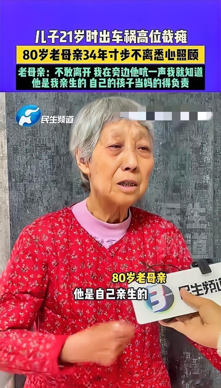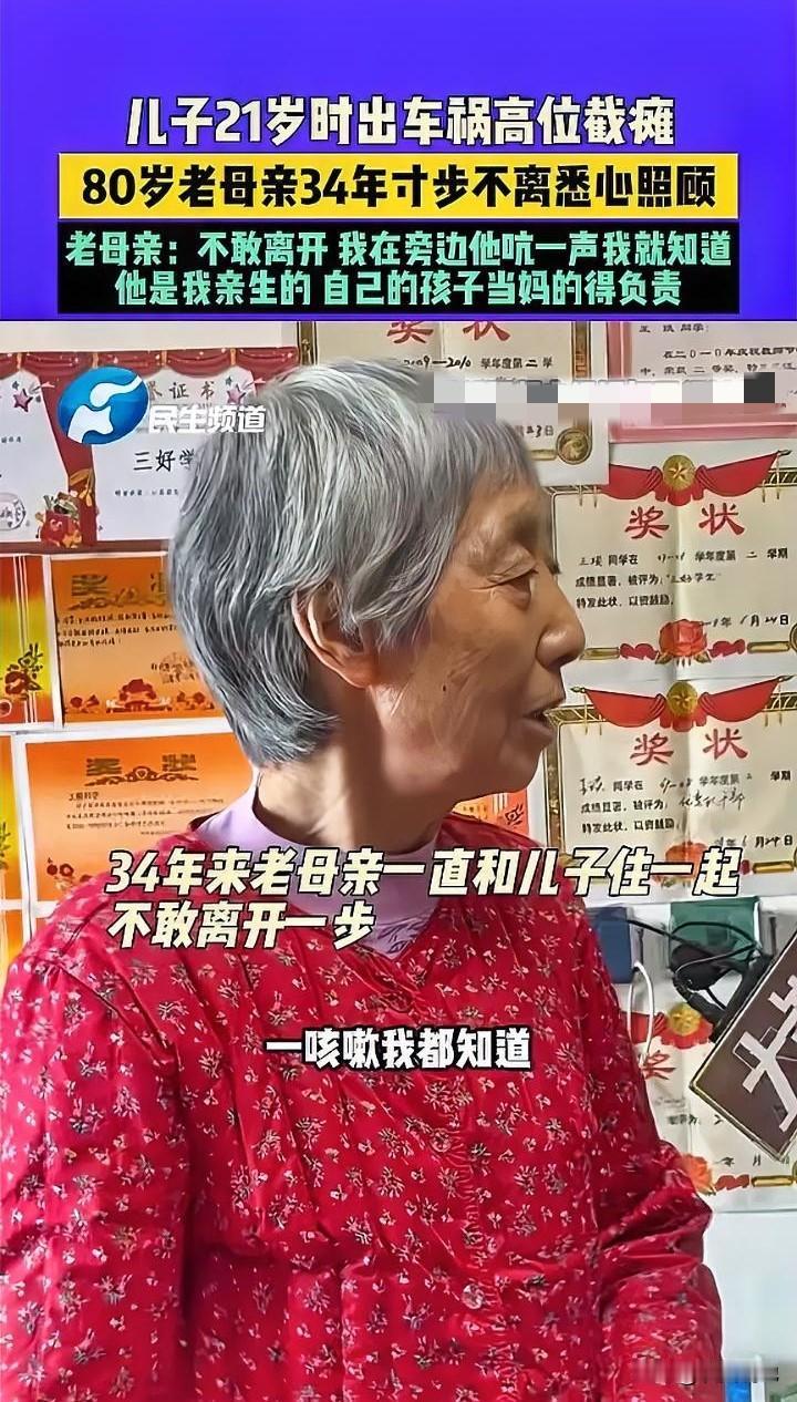 河南郑州一男子21岁意外截瘫,母亲心疼儿子,一照顾就是34年,如今已经80岁了,母亲:“他是我亲生的,自己的孩子当妈得负责任”网友:“可怜开下父母心。” 王红宾原本有一个美好的人生,奈何造化弄人,他在21岁开车发生意外,造成高位截瘫。 当母亲听到消息后,感觉像天塌了一样,整是以泪洗面,自己的儿子还这么年轻,以后的日子可咋过。 但哭过之后,母亲知道再伤心也没用,怎么让儿子好起来最要紧,于是暗暗下定了决心:就算倾尽所有,也要把儿子照顾好! 为了儿子能早日康复,母亲主动承担起了照顾儿子的责任,每天,她都要为儿子翻身、擦洗、按摩、处理大小便。 因为儿子长期卧床,为了防止他生褥疮,母亲每天都要为他翻身数十次。即使在深夜,她也要每隔两小时起床一次,给儿子翻身。为了让儿子能舒服一些,她坚持每天为他擦洗身体,并进行全身按摩,就是希望儿子有所好转。 可日子一天又一天过去了,儿子却不见有一天的好转,母亲急在心里,但是,她并没有气馁,她知道,儿子就是她的盼头。 然而,这一照顾就是34年,母亲从一个40多岁的妇女熬成了一个80岁的老人,如今,她的背也佝偻了,白发也爬满了她的双鬓。 有人问她:"你这样照顾他,累不累?苦不苦?" 老母亲总是笑着说:"累是累,但他是我儿子啊。当妈的,看不得自己孩子受苦。" 正是这样朴素的想法,让她三十四年如一日地付出。她用自己瘦弱的肩膀,扛起了儿子的整个世界。她用自己的坚韧和不离不弃,为儿子撑起了一片天。 她的故事被报道后在网上传天,许多网友都被深深感动。 有网友说:"这才是真正的母爱,伟大而无私。" 也有人说:"看到这样的母亲,我们还有什么理由不好好孝顺自己的父母?" 34年的时光,可以改变很多东西,但改变不了的,是一个母亲对儿子的爱。 这份爱,不需要华丽的语言,不需要惊天动地,它就在每天的翻身、擦洗、按摩中,在每一个不眠的夜晚里,在每一次康复训练的坚持中。 这位母亲用自己的行动告诉我们:母爱,是这世上最伟大的力量。它可以跨越时间,可以战胜苦难,可以创造奇迹。而这份爱,也将继续延续下去,直到生命的尽头。