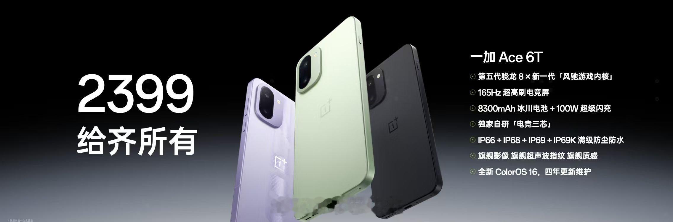 一加Ace6T 到手价2399元起,给齐所有:-第五代骁龙8 x 新一代「风驰游戏内核」-165Hz超高刷电竞屏-8300mAh冰川电池+100W超级闪充-独家自研「电竞三芯」-IP66/IP68/IP69/IP69K满级防尘防水-超光影旗舰影像、旗舰超声波指纹及旗舰质感-全新ColorOS 16全面流畅,AI更懂你性能狠Pro,续航超Max!一加 Ace 6T 即刻开启预售,提供掠影绿、电光紫、闪速黑三款配色,共5个内存版本,到手价2399元起,12月5日10:00正式开售。一加 Ace 6T原神神里绫华定制机,16GB+512TB,到手价3699元。