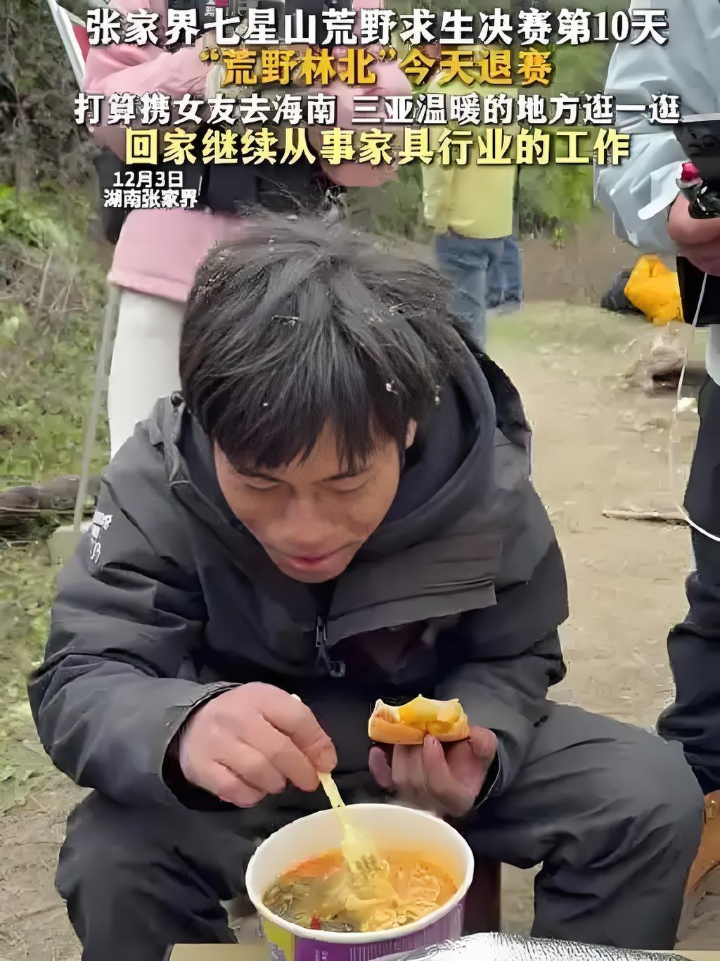 有网友看了个评论, 觉得太经典了, 说林北退赛像场蓄谋的浪漫告别,他不是输家,是提前收走了自己的人生礼物。 这小子00后,弃医从野,创业亏过钱熬到睡不够,来荒野本来想躲现实,结果看够了想看的风景, 辨得出植物,扛着旗子跑下山时说特别想家人,退赛不是撑不住,是该收收心回家了。 他求婚时卡点13:14说三餐四季有你,荒野里蹦治愈金句被喊哲学家,现在揣着七星山的石头说我来过,网友从看新鲜到跟着他乐,他哪是退赛,是把荒野的光揣兜里带走了。 谁能说这趟不值?荒野给了他答案,他给了自己交代,这哪是退赛,分明是人生又转了个漂亮弯。