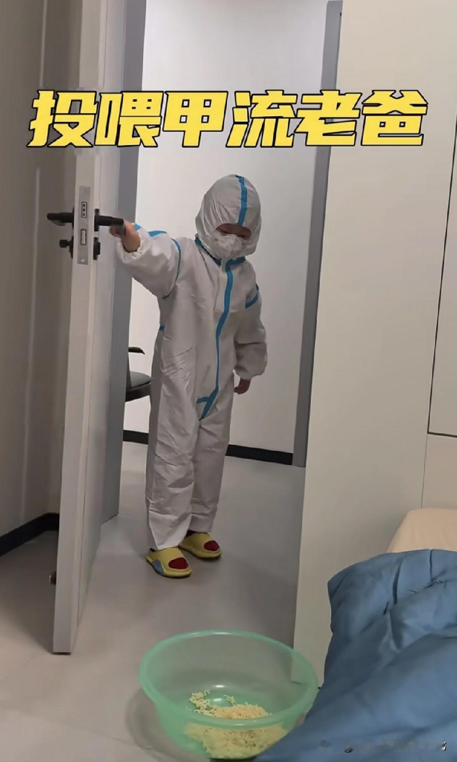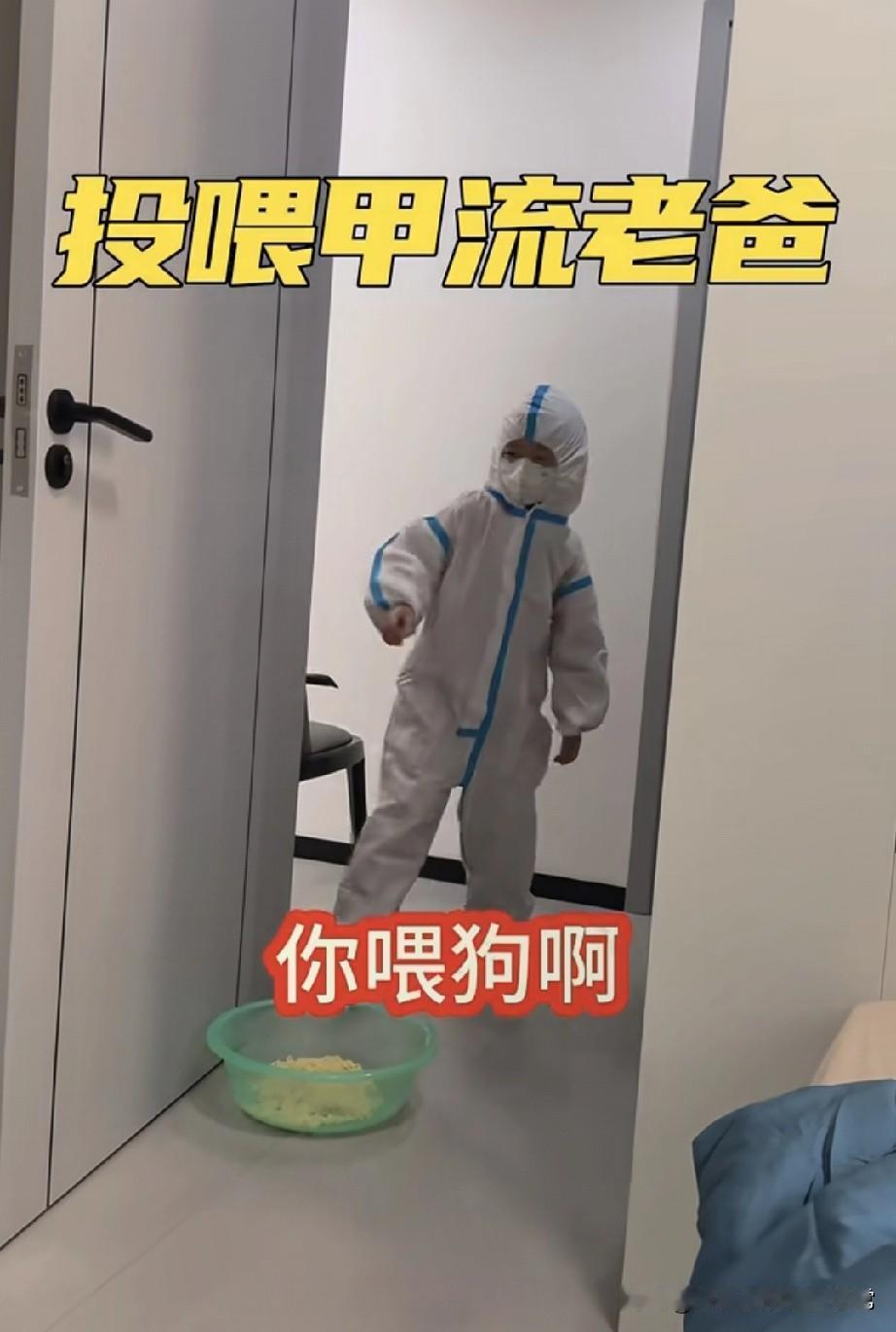 当爸爸得甲流,小孩投喂! 刷到个视频笑到喷饭:娃裹着防护服,把泡面“哐当”倒进塑料盆,往得甲流的老爹门口一撂——配文“投喂甲流老爸”,老爹直接炸了:“你喂狗啊?” 这波操作把网友整疯了:有人说“这防护到位但尊重没到位”,也有人笑“是亲娃没错,主打一个活着就行”。 但笑着笑着突然反应过来:甲流真不是闹着玩的,高烧烧到浑身瘫软时,连端碗的劲儿都没有,真要这么“投喂”,亲爹怕是得气出二次感染。 不过也有人说“特殊时期图个乐,总比不管强”——你觉得这是搞笑解压,还是没分寸的糊弄?