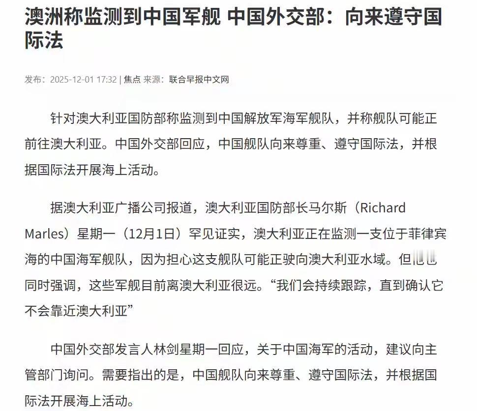 突发!澳国防部长称中国075编队现身菲律宾海,准备南下澳洲? 前一阵因为中澳铁矿石贸易谈判,而成为焦点的澳大利亚,沉寂了好一阵子。这两天刚刚因为高价订购美制AIM-260,重新回到舞台,澳大利亚国防部就又爆出一条重量级消息——一支以075为核心的两栖作战编队,已经出现在菲律宾海,下一步很有可能重演几个月前055遵义舰的动作,绕行澳大利亚。 澳大利亚这波炒作来得太突然,澳国防部长马尔斯12月2日突然宣布,一支中国海军编队出现在菲律宾海,包括075型两栖攻击舰、052D型驱逐舰和综合补给舰。他特意强调"075是解放军最新型两栖攻击舰",暗示这是"军事威胁"。但仔细看,这支编队距离澳大利亚本土还有3000多公里,连菲律宾领海都没进,澳大利亚就急着跳出来喊"狼来了",这反应过度得有点离谱。 澳大利亚最近动作频频,先是花高价买美国AIM-260空空导弹,又跟日本搞联合军演,现在又炒作中国舰队。这些操作背后,其实是澳大利亚的战略焦虑。中澳铁矿石谈判陷入僵局,中国要求降价30%,澳大利亚死活不松口。现在中国转向巴西、几内亚找替代供应商,澳大利亚急了,想用军事牌施压,逼中国在贸易谈判上让步。 中国海军编队在菲律宾海活动完全合法,这是国际水域,任何国家都有航行自由。今年5月055遵义舰绕行澳大利亚,澳大利亚也是大惊小怪,结果中国军舰全程遵守国际法,澳大利亚最后只能灰溜溜地说"全程监控"。这次又来这一套,连剧本都不换。 澳大利亚最怕的是中国海军常态化巡航,055遵义舰那次绕行,让澳大利亚第一次感受到中国海军的远洋能力。现在075两栖攻击舰也来了,这种4万吨级的两栖平台,能搭载直升机、气垫登陆艇,具备立体登陆能力。澳大利亚担心中国海军把绕行澳大利亚变成常态,就像美国海军在南海那样。 但澳大利亚忘了自己的位置,中国是澳大利亚最大的贸易伙伴,双边贸易额超过2200亿澳元,铁矿石、煤炭、农产品这些出口大头都指着中国市场。澳大利亚跟着美国搞"印太战略",在南海、台海问题上对中国指手画脚,现在又想用军事牌施压,这种"吃饭砸锅"的套路,中国早就不吃了。 中国海军编队出现在菲律宾海,其实跟澳大利亚关系不大。菲律宾海是西太平洋重要航道,中国海军要走向深蓝,必然要在这里活动。澳大利亚硬要往自己身上扯,反而暴露了心虚。真正该担心的是美国,中国海军在菲律宾海活动,直接威胁到关岛、第二岛链,这才是美国的核心利益。 澳大利亚现在处境尴尬,跟着美国跑,得罪中国这个最大客户;不跟美国跑,又怕被抛弃。这种"两头不靠"的焦虑感,让澳大利亚的外交政策越来越激进。但现实是,美国不会为澳大利亚的利益买单,中国也不会惯着澳大利亚的毛病。 中国海军编队的行动,说到底是为了维护国家利益。中国在南海、台海有核心利益,海军走向深蓝是必然选择。澳大利亚如果真想改善关系,就该停止炒作"中国威胁",停止配合美国围堵中国,回到务实合作的正轨上来。否则,等中国真把铁矿石订单转给巴西,澳大利亚哭都来不及。 各位读者你们怎么看?欢迎在评论区讨论。