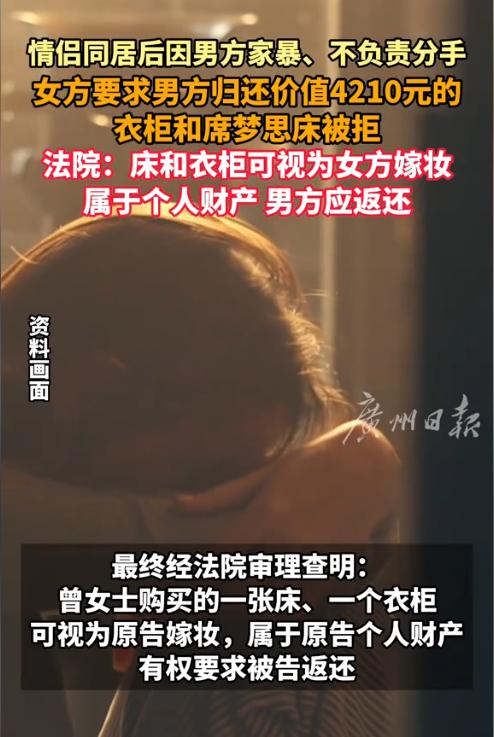 贵州,一女子因忍受不了男友的家暴,选择了分手。女子要求男友归还自己出钱购买的衣柜和席梦思床,谁知男友的母亲却表示除非女子能找回原先的衣柜和床,否则是不会退的。女子认为这衣柜和床是她的嫁妆,既然二人都已经分手,那应当返还,于是起诉到法院寻求帮助。(来源:广州日报) 据悉,曾女士和男友李某是在去年7月份的时候,通过直播认识的,由于二人聊得十分投机,感觉性格也合适,所以当天就确定了恋爱关系。 同年8月开始,曾女士和李某便开始了同居生活。本来曾女士还畅想着未来结婚后的生活,所以她自行购买了一个品牌衣柜以及一个席梦思床,共花了4210元,将李某家的旧衣柜和床给换了。 可让曾女士没想到的是,从同居以后,李某竟然有家暴倾向。二人在生活琐事上有些矛盾是十分正常的,可李某却喜欢通过暴力来让曾女士屈服。 曾女士忍无可忍,在2025年2月17日提出了分手。分手后,曾女士想把床和衣柜拉回家,却被李某的母亲阻止了,她说除非把以前的衣柜换回来,否则别想拉走衣柜和床。 曾女士气不过,于是将李某告上了法院,要求返还床和衣柜,同时要求李某补偿恋爱期间的经济支出。 对于曾女士买的床和衣柜归谁的问题,有人认为这是曾女士对李某家的赠与行为,既然赠送了又凭什么要回去? 还有人认为,才认识当天就确定了恋爱关系?认识一个月就同居?能了解透一个人吗?现在的女孩子太不懂得保护自己了。 《民法典》第657条规定,赠与合同是赠与人将自己的财产无偿给予受赠人,受赠人表示接受赠与的合同。第658条规定,赠与人在赠与财产的权利转移之前可以撤销赠与。 由此可见,在赠与的财产交付受赠人手中,受赠人接受赠与后,这个财产就归受赠人所有了。撤销赠与的时间必须卡在床和衣柜的所有权转移之前。 很显然,曾女士已经把衣柜和床赠与给李某了,那曾女士自然无法要回床和衣柜。 但是法院审理后认为,曾女士购买床和衣柜的目的,是为了以后结婚使用。 也就是说,这床和衣柜是曾女士自己购买的嫁妆。 法律上虽然没有规定嫁妆是否应当返还,但按照风俗来说,男方支付了彩礼,女方一般是要给嫁妆的。 既然如此,嫁妆是否应当归还即便没有明确规定,也可以参照彩礼的规定进行处理。 《关于适用婚姻家庭编的解释(一)》第5条规定,当事人请求返还按照习俗给付的彩礼的,如果查明属于以下情形,人民法院应当予以支持:(一)双方未办理结婚登记手续。 由此可见,曾女士既然未与李某领证结婚,那么这个嫁妆的确应当予以返还,这才符合权利义务相等的原则。 至于曾女士要求李某给予她一些经济补偿,但法院调查发现,曾女士并未提交相应的证据,而李某一方表示在恋爱期间,李某也有一定的经济支出。 因此,法院未支持曾女士提出的经济补偿的请求。 最终,法院判决李某应当返还曾女士那套品牌衣柜和席梦思床。