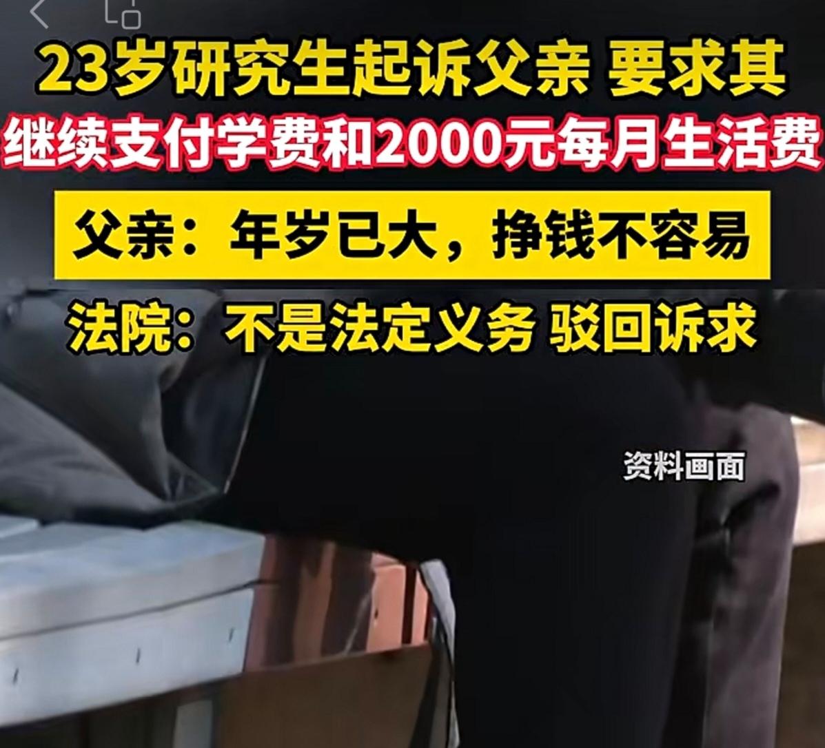 都23岁了,还起诉父亲继续支付学费和生活费,非常不应该。虽然说一般情况下,父母都会尽全力扶持儿女读大学,甚至研究生、博士生。并为他们提供力所能及的经济条件支持,辅助儿女完成学业。 但是,这是基于亲情,是父母对子女的一种托举,一种期盼。这不意味着,父母一定要为此继续付出。因为年满18周岁以后,就是成年人了,在法律上来说,父母是没有义务再继续扶养儿女的。 之所以父母会全力支持儿女继续读大学,甚至在往后娶妻生子上,也会继续支持,那是基于血脉情亲,一代人托举一代人。 但扶养未成年子女和全力托举成年子女,是两个概念,并不能混为一谈。所以一个23岁的研究生,因为学费问题,将父亲告上法庭,实属不应该。