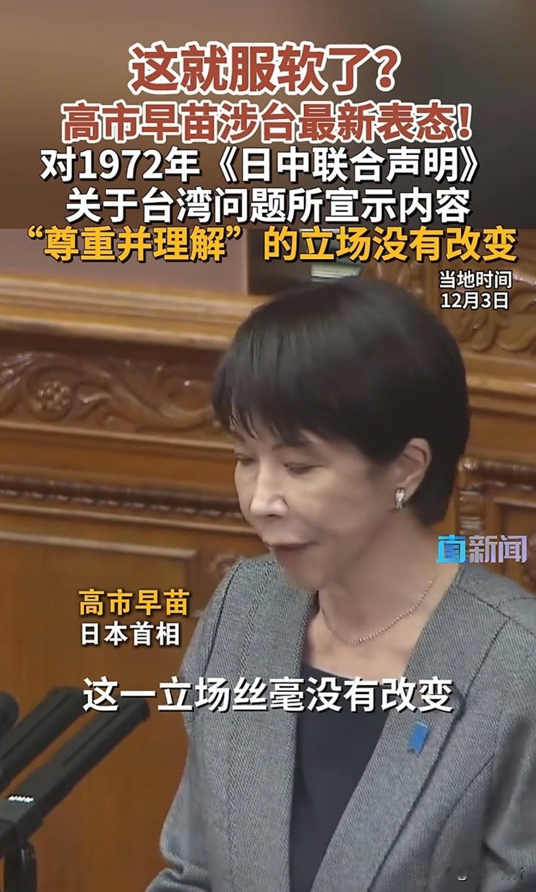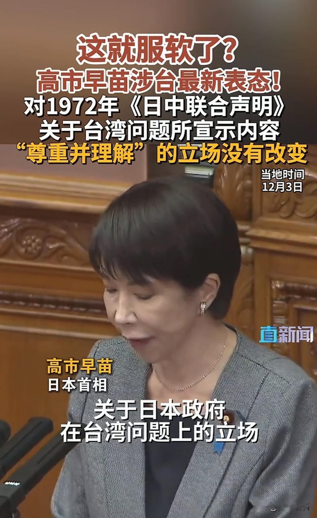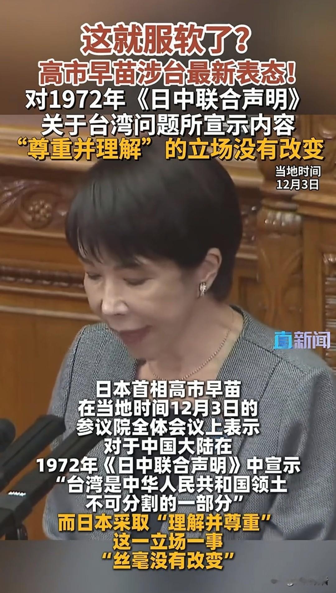 高市早苗涉台表态大反转?别被“服软”假象骗了!😤 最近刷到高市早苗的涉台最新发言,说日本对台湾的立场没改变,还重申“尊重并理解”1972年《日中联合声明》的内容,不少人说这是服软了?醒醒!这波操作根本不是认怂,而是满满的政治套路啊! 先回顾下前情提要:之前她疯狂蹦跶,喊着“台湾有事就是日本有事”,明目张胆触碰中国红线,结果被中方强硬反制,连美国都懒得陪她冒险,日本国内更是抗议不断,渔民卖不出货、旅游业亏惨,经济压力直接拉满😅 现在突然“降温”,说白了就是压力扛不住了!但这绝对不是真心悔改: ❌ 只说“尊重理解”,压根没明确承认一个中国原则的核心,更没为之前的错误言论道歉; ❌ 日本行动上没停过,一边搞军事扩张,一边和台湾暗戳戳搞“务实合作”,本质是想模糊边界; ❌ 这就是典型的“技术性降调”,表面立场不变,实则为后续的小动作留足余地,既想平息争议又不想放弃野心。 台湾问题从来都是中国内政,《开罗宣言》《波茨坦公告》早就明确了台湾是中国领土的一部分,这是铁打的事实和法理基础!🇨🇳 任何政客想玩文字游戏、打“台湾牌”谋私利,都是在逆历史潮流,最终只会搬起石头砸自己的脚。 别被表面的“温和表态”迷惑,警惕背后的真实图谋才是关键!同意的朋友赶紧点赞转发,让更多人看清真相吧。