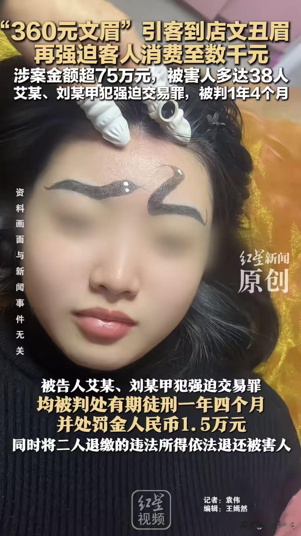 山东聊城,美容店老板推出360元特价纹眉套餐,然后等顾客到店后,有的给纹一半就开始要求升级,不然不给纹另一半,就算你自认倒霉要走也不可以,然后通过强迫或者软B力的方式强迫顾客升级套餐到1680元,或者上万元的套餐,如果碰到软硬不吃的顾客,店家就会故意给纹一个丑眉,让你见不了人,后来此事被曝光,经查,被骗顾客多达38人,总金额超75万,没想到法院最后这样判了! 艾某和刘某俩人开了个美容店,一开业,他们就在网上、朋友圈还有本地的一些群里疯狂发广告。 主打一个360元纹眉套餐的特价福利。 要知道360块钱,就能做一对精致的纹眉,这价格放在哪,那可真是相当有诱惑力。 不管是爱美的小姑娘,还是想拾掇拾掇自己的阿姨们,看到这个价格,心里难免都会心动。 就这么着,一批又一批的顾客,冲着这360元的特价套餐,走进了艾某和刘某的店里。 谁也没想到,这一进去,就掉进了俩人精心布置的坑里。 顾客一到店,纹眉师那都热情得不得了,端茶倒水,嘘寒问暖,把顾客哄得嘴都合不上。 然后没一会就开始设计眉形,一开始的流程都挺正常,消毒、设计、然后就拿起纹眉笔开始操作。 可等纹到一半,眉毛一边刚有个雏形,另一边还没动的时候,纹眉师就会突然停下手里的活。 就开始跟顾客说:姐,你看你这眉毛,天生条件不太好,眉骨有点突出。 或者眉毛底色有点重,360元的这个基础套餐,用的色料和技术都有限。 继续纹下去效果肯定不好,到时候颜色会发蓝、发灰,还容易掉色,到时候你还得花钱洗,更麻烦。 要么就说:妹妹,你这脸型配这个基础眉形太普通了,凸显不出你的气质。 我们店里有个升级套餐1680到上万的都有,用的色料不同。 有的是国产有的是进口纯植物色料,还有首席设计师亲自操作,纹出来那叫一个自然立体,跟你这五官绝配。 一开始,他们还会温柔地劝说,给顾客解释,说升级套餐有多好多好。 可要是顾客不为所动,表示自己就想做360元的套餐时,纹眉师就会不愿意。 直接翻脸,直接告诉顾客360元的套餐只能做一半,想做完整的,必须升级。 不升级的话,这另一半我可没法纹,你要是现在走,这半边眉毛也没法改。 对此情形大多数人都会选择升级套餐,毕竟谁也不想纹一个眉毛就出门。 有的不愿意升级的店里的人就轮流做工作,有时候可以从早上十点到晚上。 除了上厕所就没让客户从床上起来过,势必就是让你升级。 但也不是所有顾客都能好说话,要是碰到一些性格比较刚烈,软硬不吃的顾客。 明确表示:我不升级,你要么把剩下的纹完,要么我就走。 遇到这样的顾客艾某和刘某就会使出更坏的招数, 他们表面上可能会答应,继续纹眉,但实际上,心里已经开始使坏。 接下来,他们就会故意敷衍了事,用最差的技术、最难看的眉形,给顾客纹剩下的一半。 有的眉毛被纹得一高一低,有的又粗又黑像两条毛毛虫,还有的颜色斑驳不均,简直丑得没法见人。 顾客一看自己的眉毛变成这样,又气又急,纹上去的眉毛不是说洗就能洗掉的,就算洗也得花不少钱,还得遭罪。 不少顾客只能忍气吞声,要么花钱让他们修改(其实又是变相升级套餐),要么只能自认倒霉。 其中有一名环卫工人,花360元去纹眉,被艾某和刘某合伙把特价套餐升级到29800元。 要知道,环卫工人的工资本来就不高,这些钱可能是他大半年甚至一年的收入。 就这样,艾某和刘某用这种半强制升级,恶意丑化眉形的手段,一次又一次地欺骗顾客。 一开始,还有顾客觉得可能是自己运气不好,或者是沟通出了问题,没敢声张。 可随着被骗的人越来越多,刘某和艾某的套路也逐渐暴露出来。 后来这件事经曝光,网友们纷纷指责艾某和刘某太黑心,简直是丧良心的生意! 360元变1680元,甚至29800元,咋那么敢要呢,还强迫消费,太过分了! 不花钱就故意给顾客纹丑眉,这也太缺 德了吧! 相关部门得知此事后,迅速展开调查,经过核实被骗客户多达38人,这些顾客的消费金额从1680元到上万元不等。 有的人甚至被忽悠着升级到了好几万的顶级套餐,统计下来,总金额竟然超过了75万元! 《刑法》第226条:以暴力、威胁手段,实施“强迫他人提供或者接受服务”等行为,情节严重的,处三年以下有期徒刑或者拘役,并处或者单处罚金。 刘、艾两人先以360元特价套餐诱骗顾客到店,纹眉到一半就停止服务逼迫升级。 对不愿升级的顾客,采取轮流劝说、限制其离开床位等软暴力手段,从早到晚纠缠。 对强硬拒绝的顾客还故意纹丑眉,这些行为本质都是用心理胁迫和变相限制人身自由的方式。 强迫顾客接受高价升级服务,完全属于情节严重的标准。 最终法院判决:被告人艾某、刘某甲犯强迫交易罪,均被判处有期徒刑一年四个月,并处罚金1.5万元,同时将二人退缴的违法所得依法退还被害人。 对此,你怎么看这件事呢?