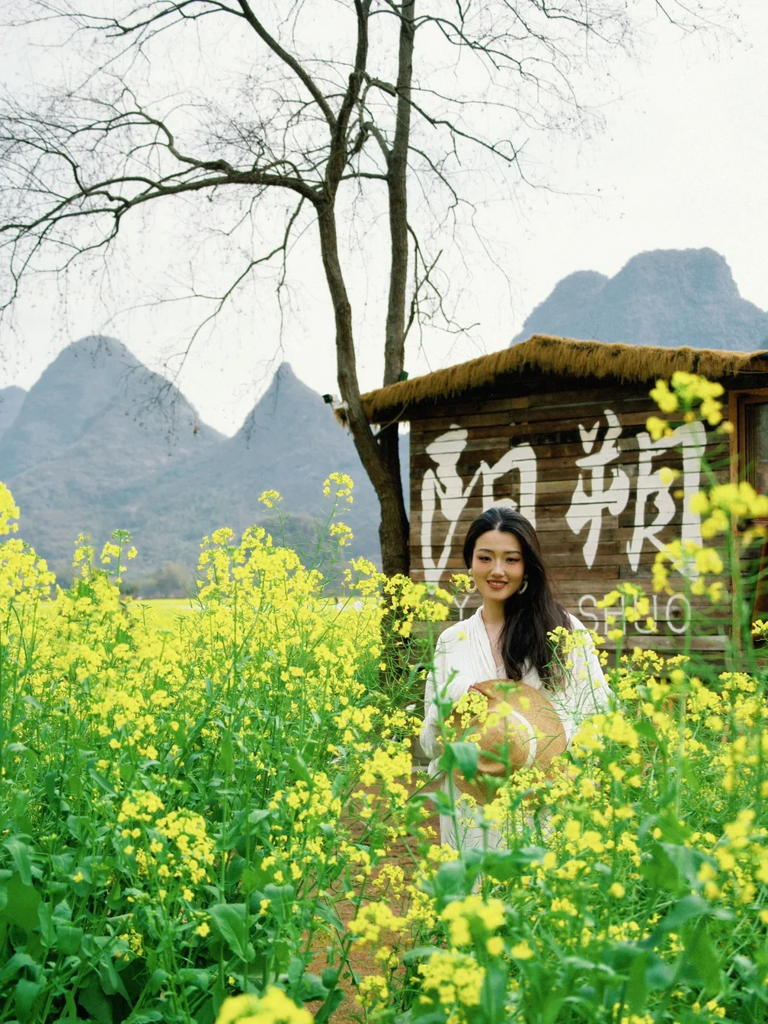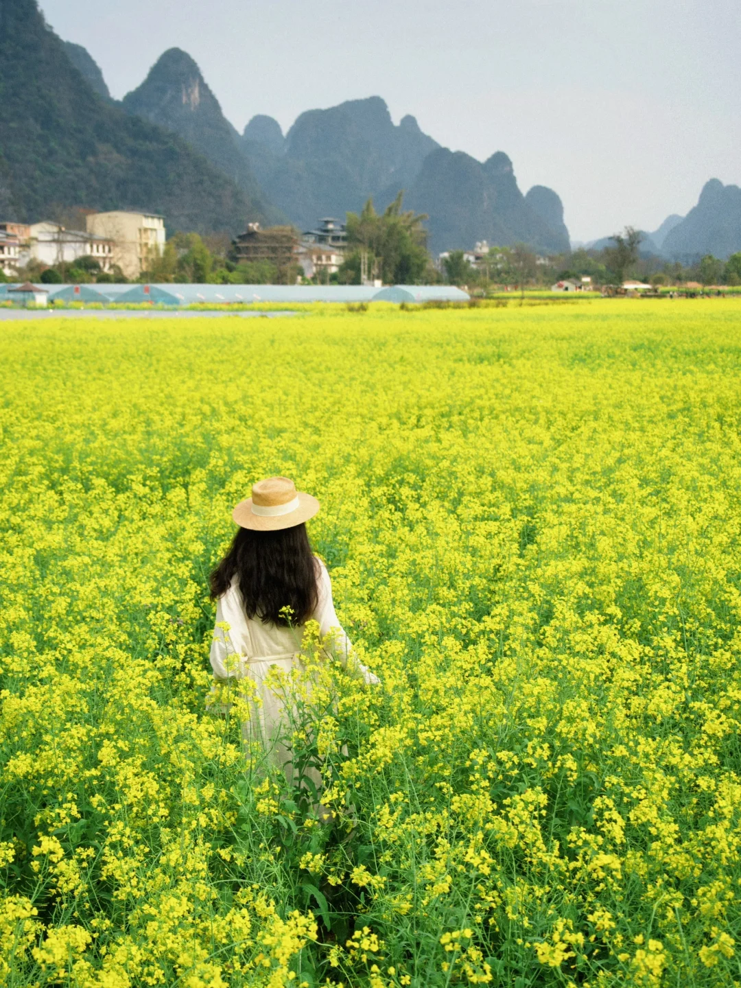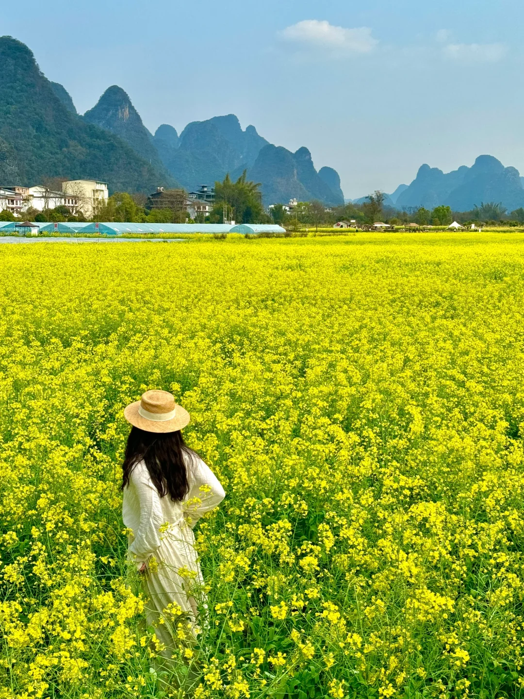 怎么没人告诉我阳朔的春天这么美啊! 除了经典的漓江山水,喀斯特地貌+油菜花的组合也十分好拍!去一个地方可以拍多种风光,超值[害羞R] 骑着小电驴穿梭在十里画廊的花海里 仿佛闯入了油画版的世界 花期就快结束了!想去的姐妹们抓紧时间! 📍骑行路线 一尺稻田咖啡-村上春树-张先生的树屋,这段路上的油菜花开的最好,一路上很多打卡设施可以拍照~ 👗穿搭建议 建议穿浅色哦!和浓郁的油菜花氛围很搭~记得带个👒 📷 拍摄于2025.3月中旬