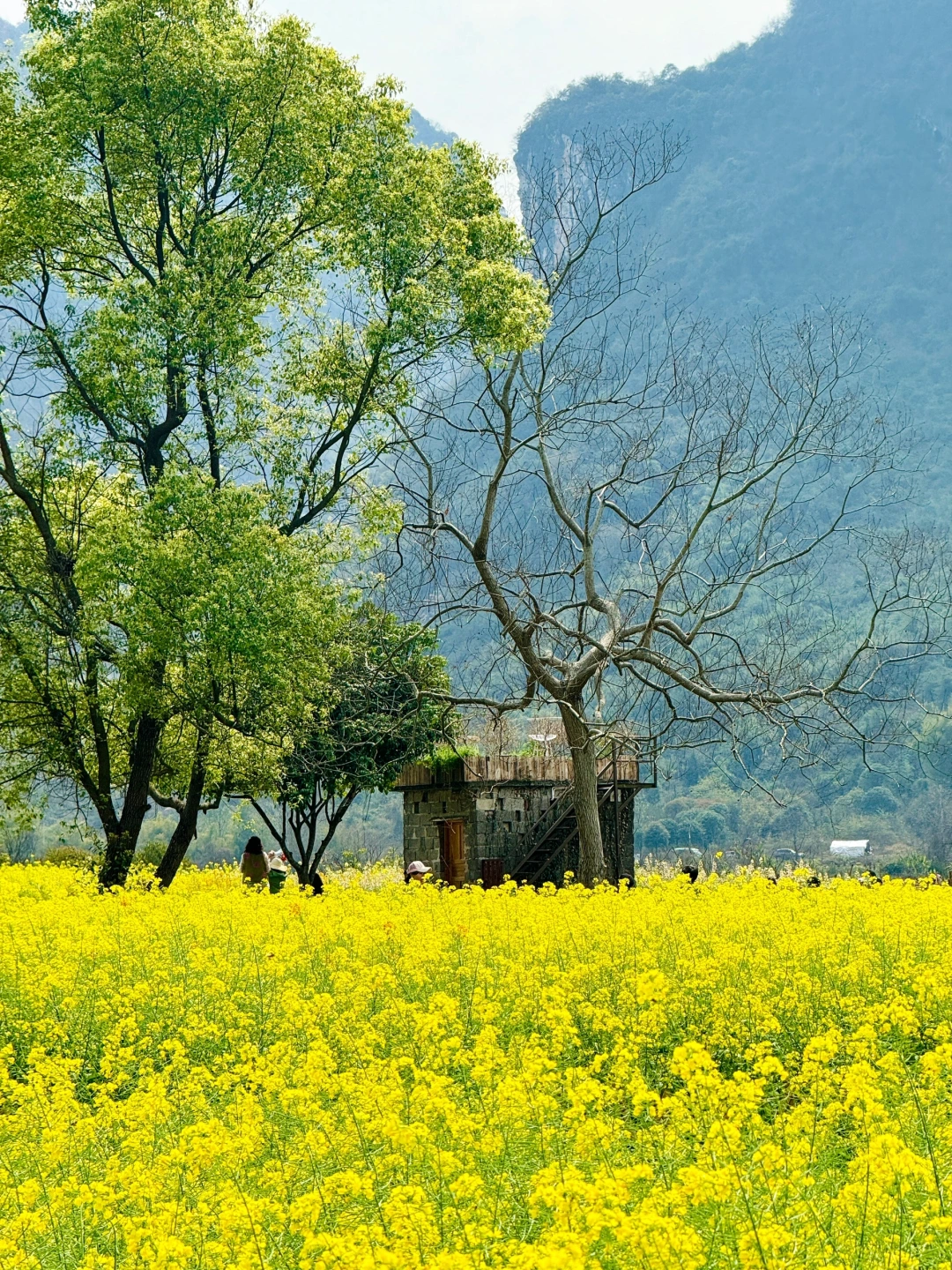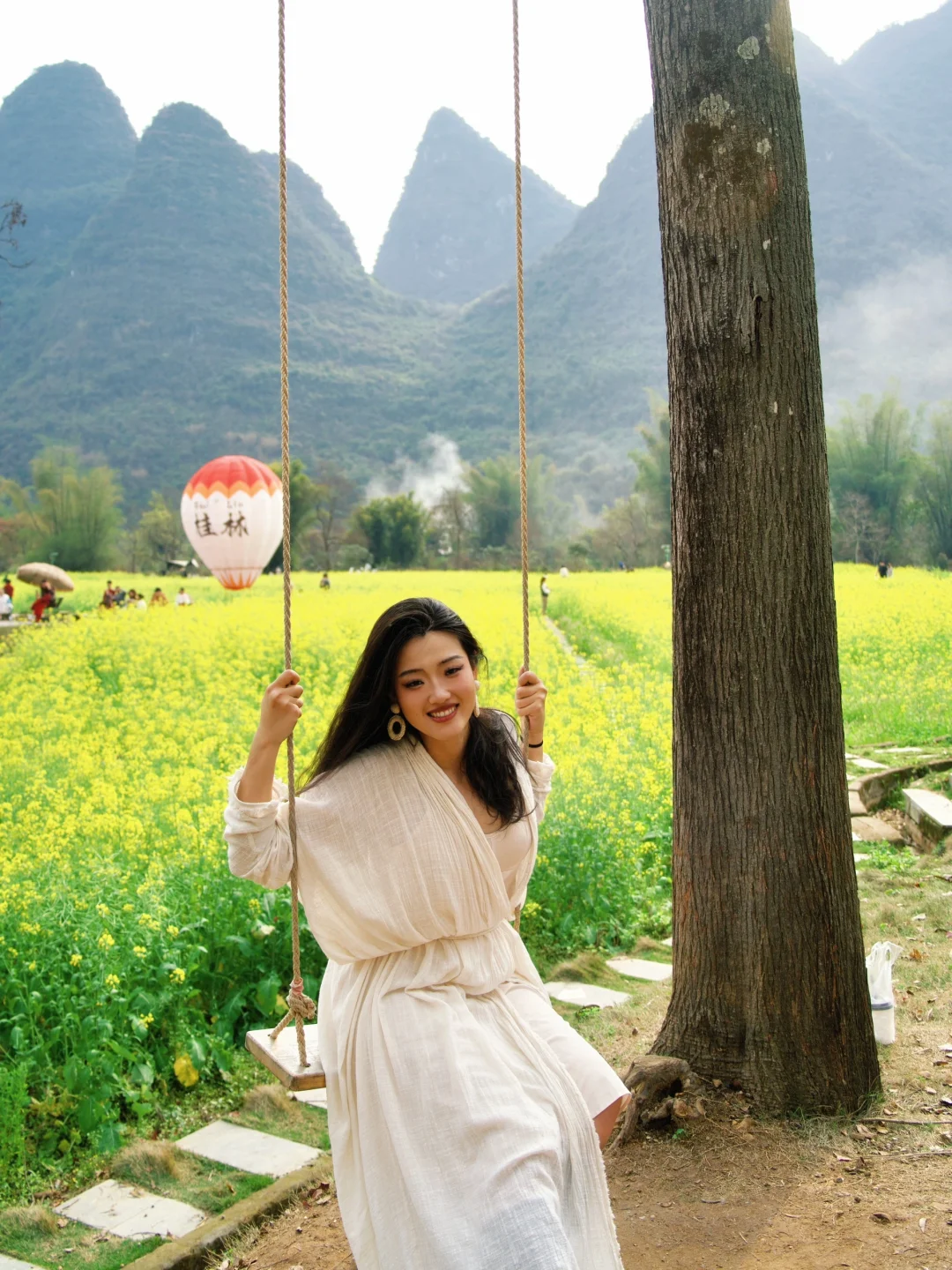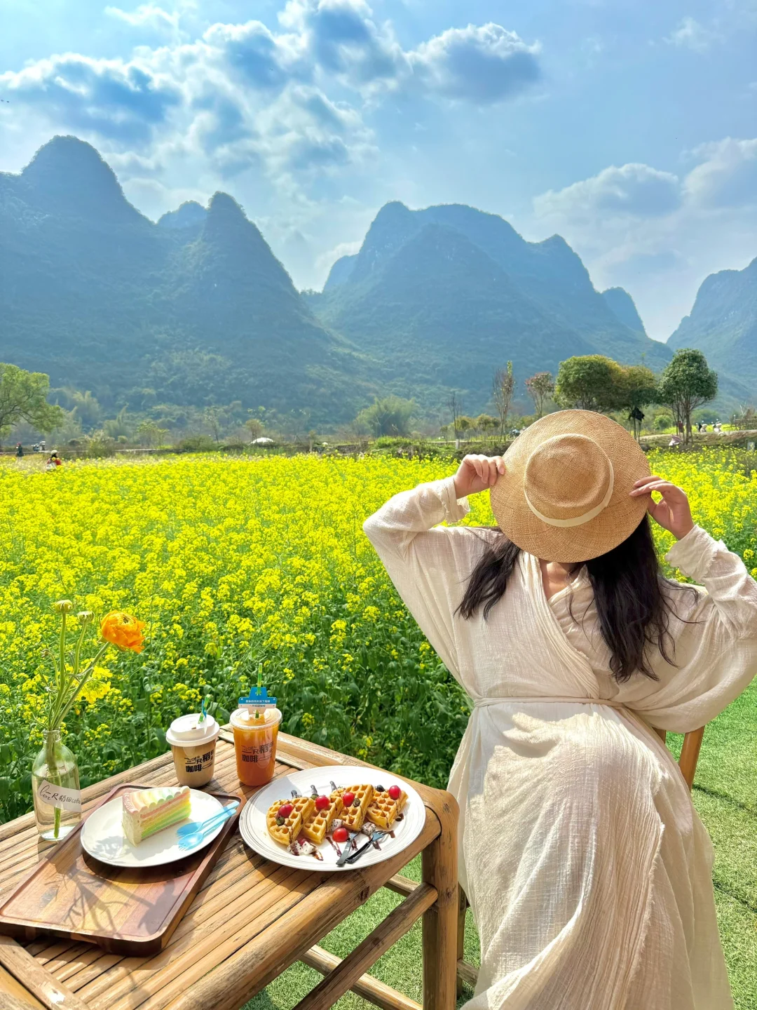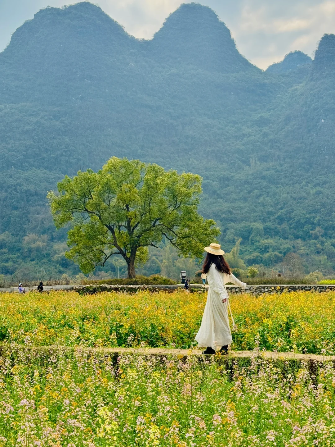 怎么没人告诉我阳朔的春天这么美啊! 除了经典的漓江山水,喀斯特地貌+油菜花的组合也十分好拍!去一个地方可以拍多种风光,超值[害羞R] 骑着小电驴穿梭在十里画廊的花海里 仿佛闯入了油画版的世界 花期就快结束了!想去的姐妹们抓紧时间! 📍骑行路线 一尺稻田咖啡-村上春树-张先生的树屋,这段路上的油菜花开的最好,一路上很多打卡设施可以拍照~ 👗穿搭建议 建议穿浅色哦!和浓郁的油菜花氛围很搭~记得带个👒 📷 拍摄于2025.3月中旬