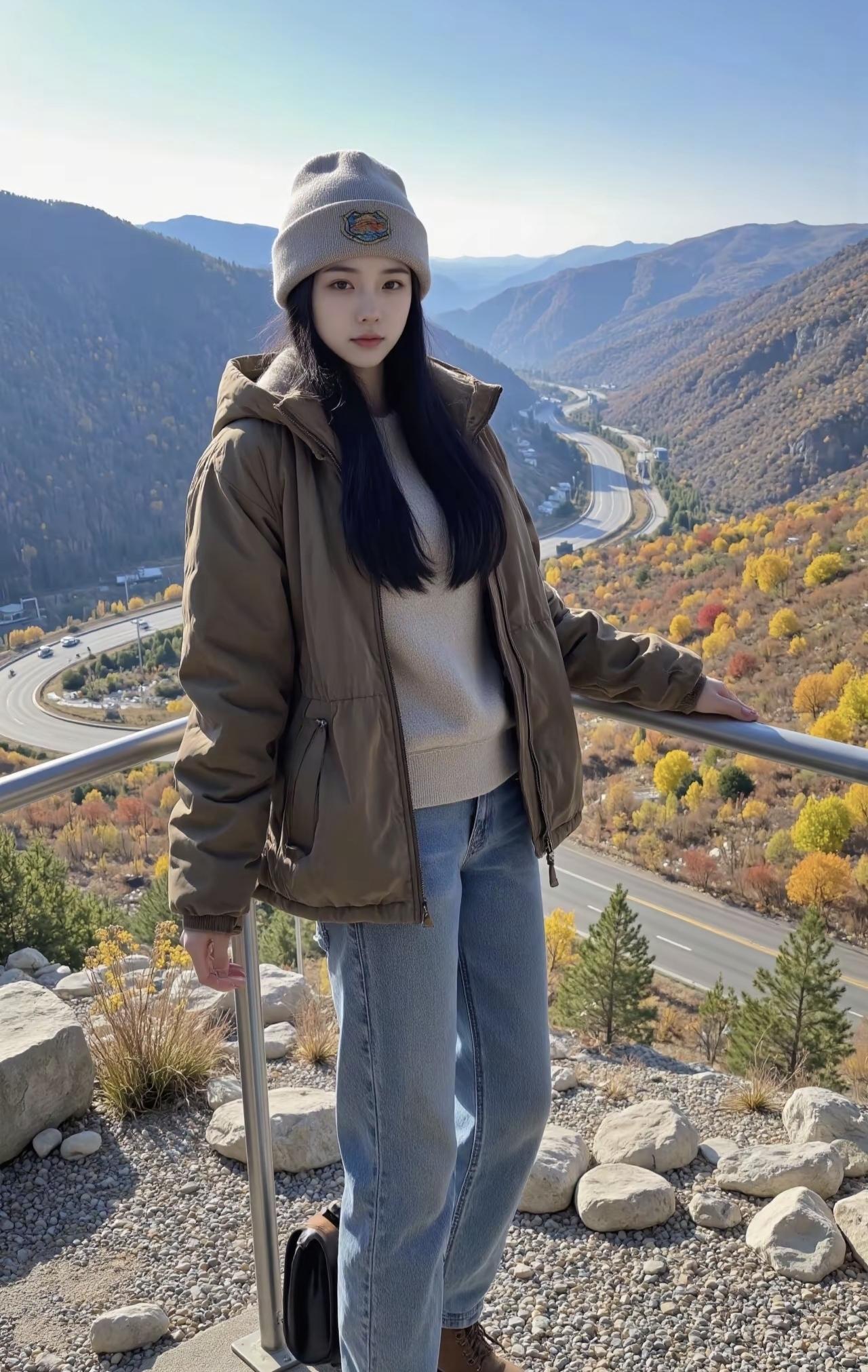 风把秋山揉成打翻的调色盘,裹紧黑外套时,刚好接住一捧暖光。山路绕着金黄往云里钻,今天的松弛感,是软乎乎的帽子和磨旧牛仔给的。