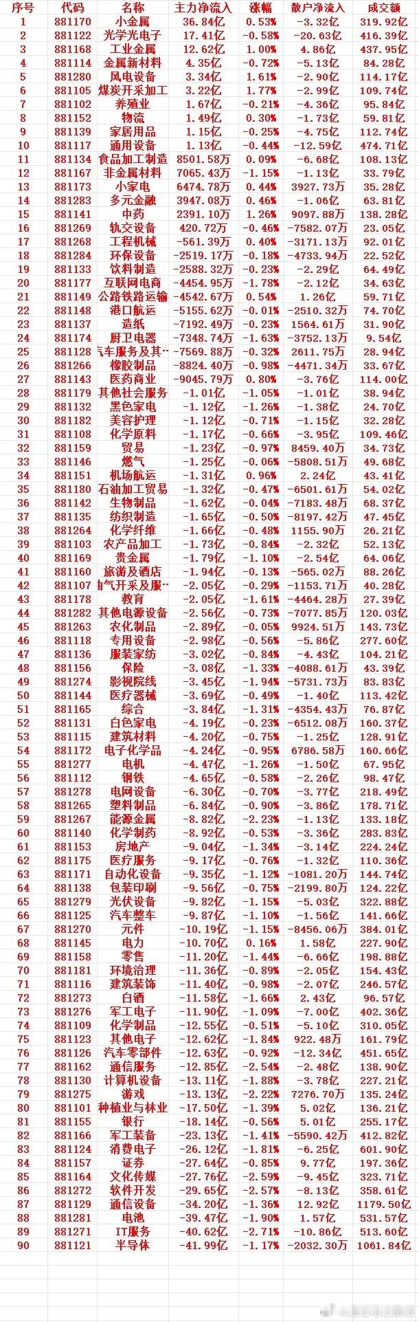 12月3号收盘,主力趁低位,“大幅买入”的行业名单(全行业)1 881170 小金属 36.84亿 0.53% -3.32亿 319.92亿2 881122 光学光电子 17.41亿 -0.58% -20.63亿 416.39亿3 881168 工业金属 12.62亿 1.00% 4.86亿 437.95亿4 881114 金属新材料 4.35亿 -0.72% -5.13亿 84.28亿5 881280 风电设备 3.34亿 1.61% -2.90亿 114.17亿6 881105 煤炭开采加工 3.22亿 1.77% -2.99亿 109.74亿7 881102 养殖业 1.67亿 -0.21% -4.36亿 95.84亿8 881152 物流 1.49亿 0.30% -1.73亿 59.81亿9 881139 家居用品 1.15亿 -0.25% -4.75亿 112.74亿10 881117 通用设备 1.13亿 -0.44% -12.59亿 474.71亿11 881134 食品加工制造 8501.58万 0.09% -6.68亿 108.13亿12 881167 非金属材料 7065.43万 -1.15% -1.13亿 33.79亿13 881173 小家电 6474.78万 0.44% 3927.73万 35.28亿14 881283 多元金融 3947.08万 0.46% -1.06亿 63.81亿15 881141 中药 2391.10万 1.26% 9097.88万 138.28亿主力资金流向核心特征流入 TOP3 集中在资源类:小金属(36.84 亿)、光学光电子(17.41 亿)、工业金属(12.62 亿),其中工业金属、小金属同步实现正涨幅,资金与行情形成共振。流出 TOP3 以科技、制造为主:半导体(-41.99 亿)、IT 服务(-40.62 亿)、电池(-39.47 亿),半导体成交额超千亿但主力撤离,资金分歧极大。多数板块呈现 “主力与散户反向”:90 个板块中,仅工业金属、中药等少数板块主力与散户资金同向,其余多为 “主力进、散户出” 或 “主力出、散户进”。成交额与涨幅的关键关联高成交额板块资金分歧突出:通信设备(1179.50 亿)、半导体(1061.84 亿)、消费电子(601.90 亿)成交额居前,但均为主力净流出,散户资金仅通信设备流入。正涨幅板块多获主力加持:煤炭开采加工(1.77%)、风电设备(1.61%)、中药(1.26%)等正涨幅板块,主力资金均为净流入,资金助推行情特征明显。