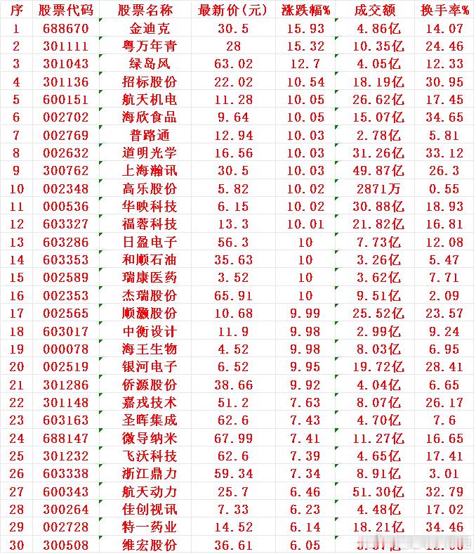 12月3日,均线多头排列的30名单汇总金迪克:最新价 30.50元,涨跌幅 +15.93%粤万年青:最新价 28.00元,涨跌幅 +15.32%绿岛风:最新价 63.02元,涨跌幅 +12.70%招标股份:最新价 22.02元,涨跌幅 +10.54%航天机电:最新价 11.28元,涨跌幅 +10.05%(涨停)海欣食品:最新价 9.64元,涨跌幅 +10.05%(涨停)
