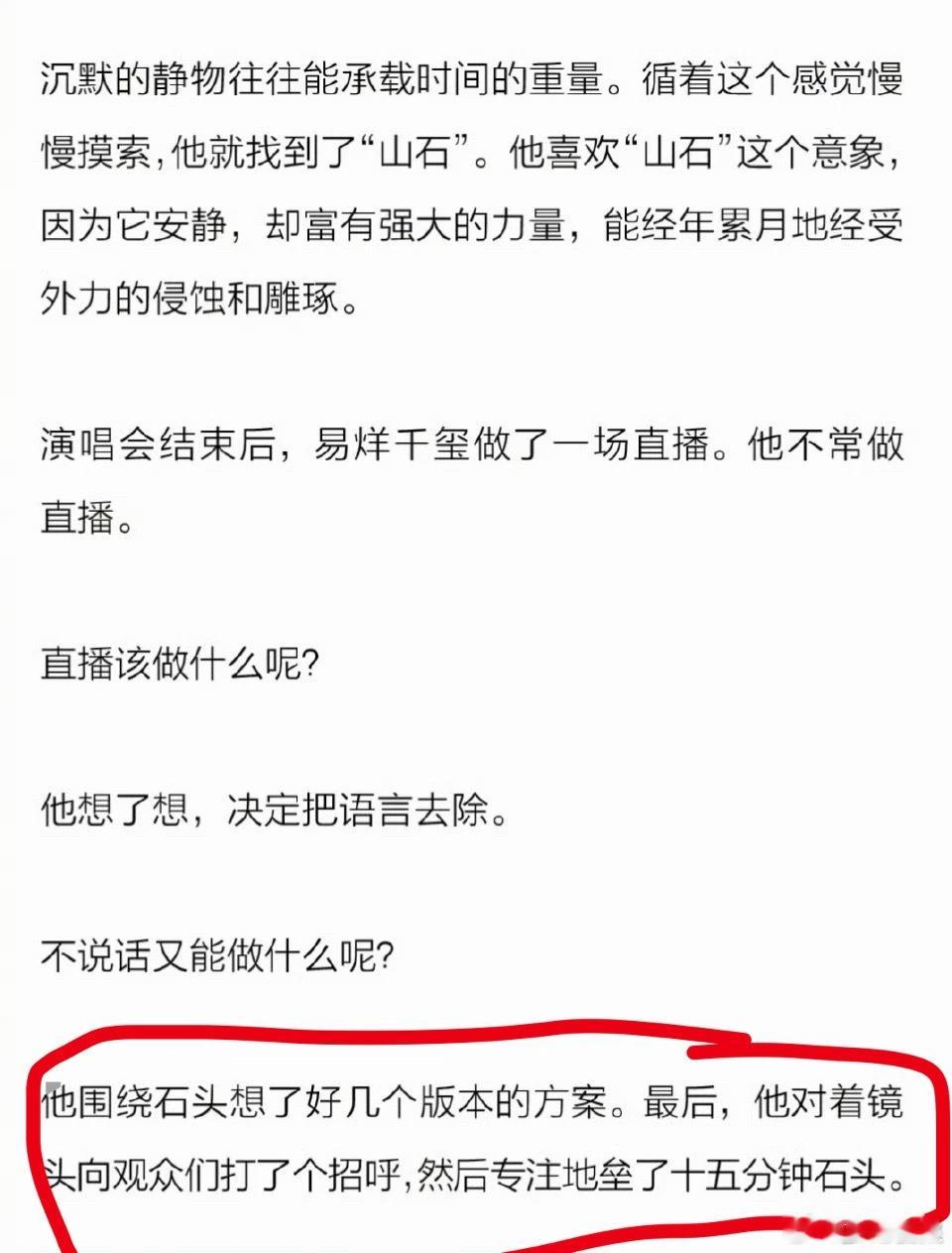 易烊千玺垒石头直播是自己想的原来上次易烊千玺垒石头的直播是他自己想的我还以为是团队策划的呢,毕竟这场直播挂了好几个热搜上去,传播效果很好啊!易烊千玺