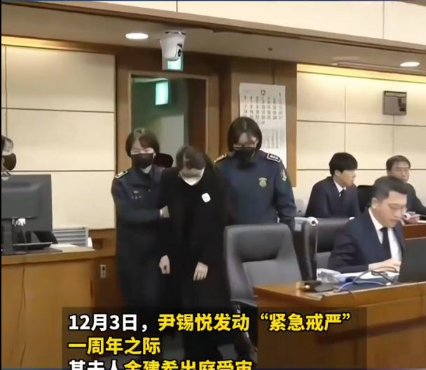 12月3日,许久不见前韩国总统夫人金建希出庭受审,画面显示她戴着口罩低着头无法自己行走,被两位法警搀扶着走向被告席,韩媒称她双腿发软。韩国法院也是挺会选日子的,刚好选在尹锡悦发动紧急戒严满一周年之际,真是很会整节目效果啊。韩国媒体报道检方问了她三个问题,她都拒绝回答,看来是要抵抗到底。 想当初作为总统夫人多么的意气风发不可一世,现在成了阶下囚风光不再,连颜值都一去不复返,看来是看守所里没有美容服务[笑哭]