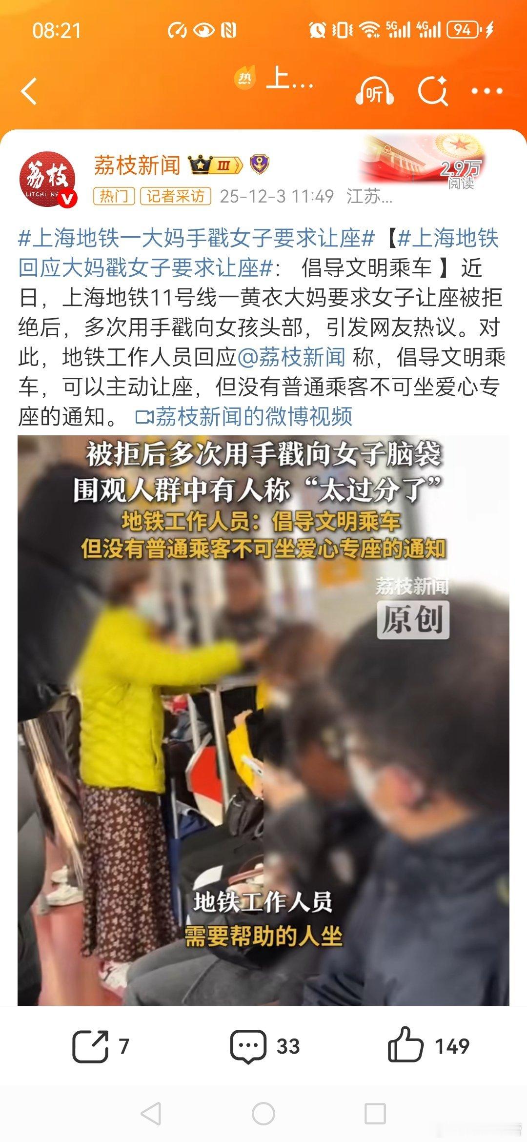 上海地铁一大妈手戳女子要求让座【上海地铁回应大妈戳女子要求让座老人可能对爱心专座有误解。如果是我,立即让给老人,没必要为了一个座位非起冲突,年轻人站一会也无妨。 当然让座是一种道德行为,我高尚我愿意让座。反之,则不让。阿姨可以协商,但强迫对方就太过了。除非有法律规定:必须让座。