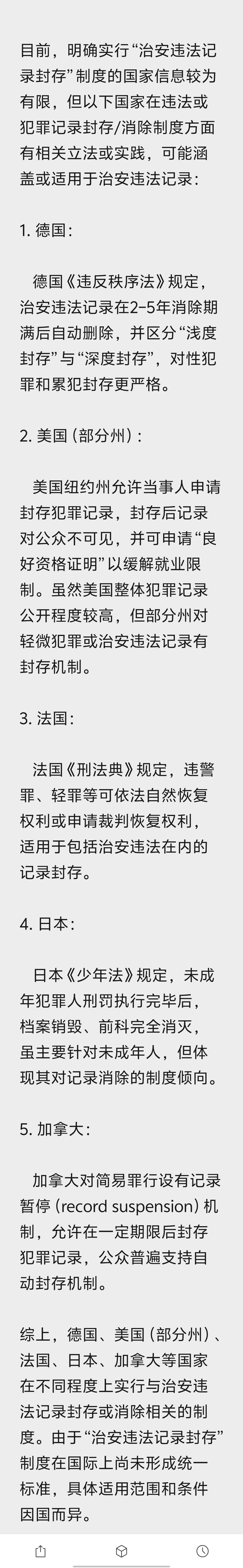 专家说违法记录封存制度是法制巨大进步,没想到有这么巨大 刚问KIMI,目前哪些国家实行违法记录封存,发现亚洲只有日本一个国家实行,欧美也只有德国、法国、加拿大以及美国部分州实行。 kimi比较了一下,德国、美国(部分州)、法国、日本、加拿大等国家在不同程度上实行与治安违法记录封存或消除相关的制度。 这些国家对违法记录封存都有详细分类以及具体限制,而我国即将实施的封存制度将全部治安违法记录进行封存。 没有违法种类要求,没有年限要求,不需要本人申请,全部自动封存。 这大约是在立法制度上我国首次大幅领先欧美日发达国家了,确实是巨大的进步,非常巨大。