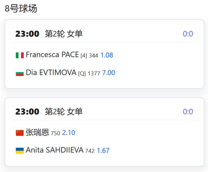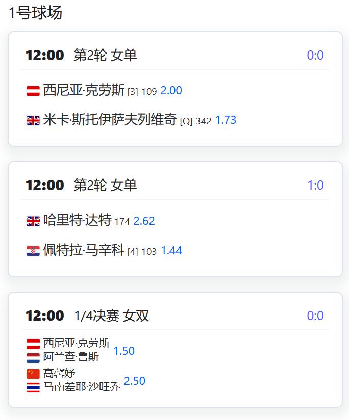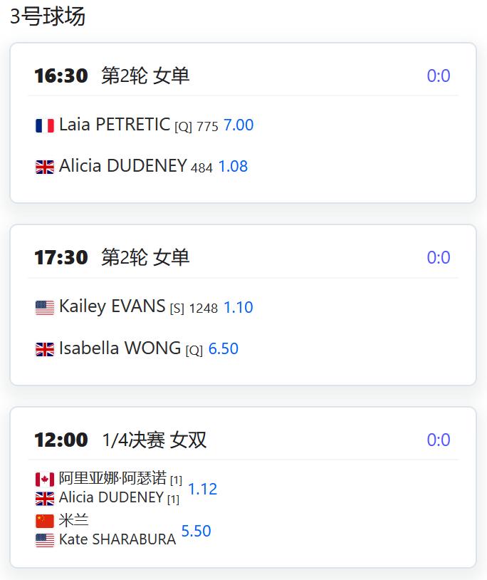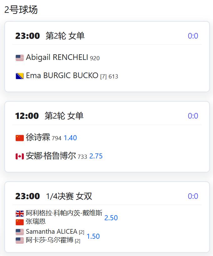 今日赛程: W125昂热,女单第二轮,张帅将对阵德国老将巴瑟尔,两人此前四次交手都由德国人胜出; W100迪拜,女双四分之一决赛,高馨妤/沙旺乔将对阵克劳斯/鲁斯; W35德通纳海滩,女单第二轮,徐诗霖将对阵加拿大的格鲁博尔; 小将张瑞恩继续一日双赛,单打对阵乌克兰的萨迪埃娃,双打对阵2号种子美国组合; W35莫纳斯提尔,女双四分之一决赛,米兰/莎拉布莱对阵头号种子阿瑟诺/杜德尼。