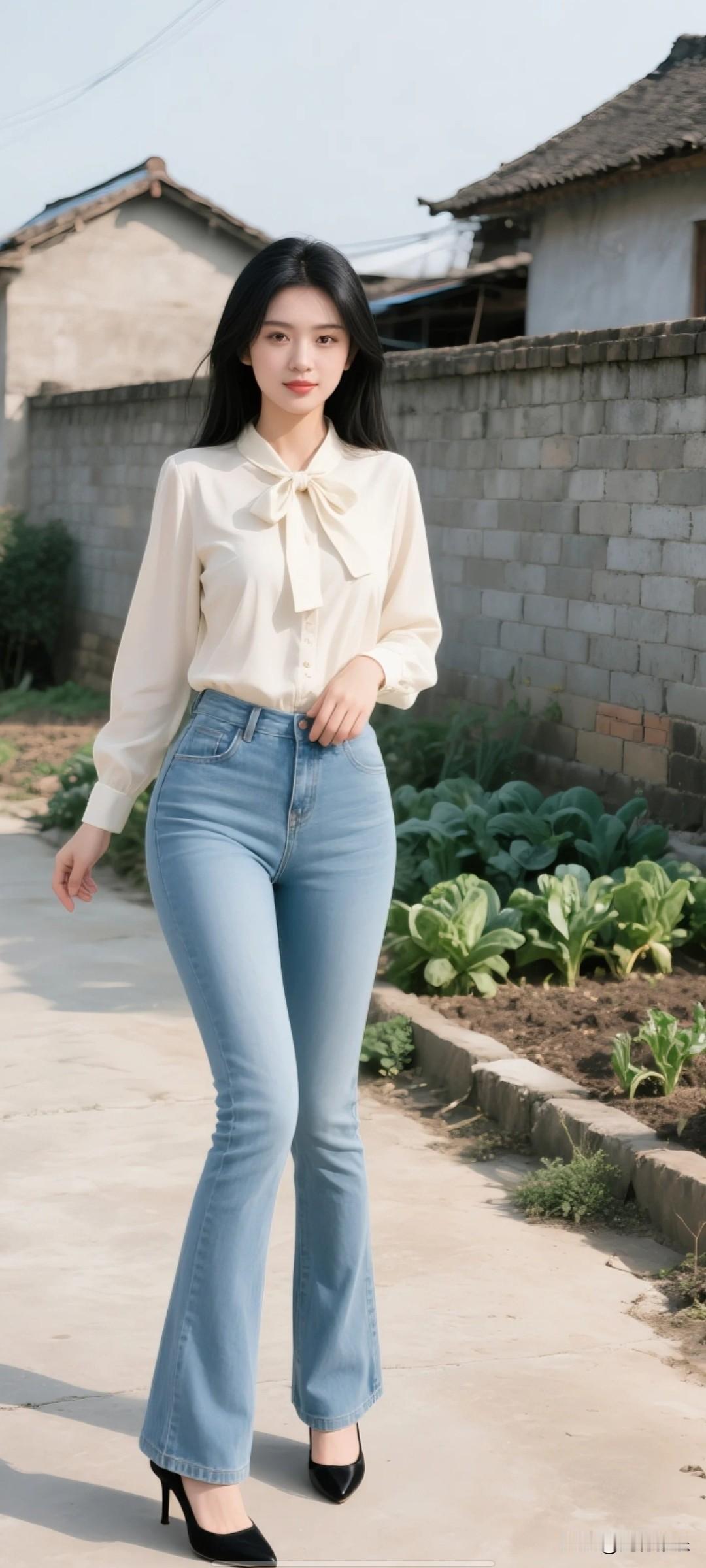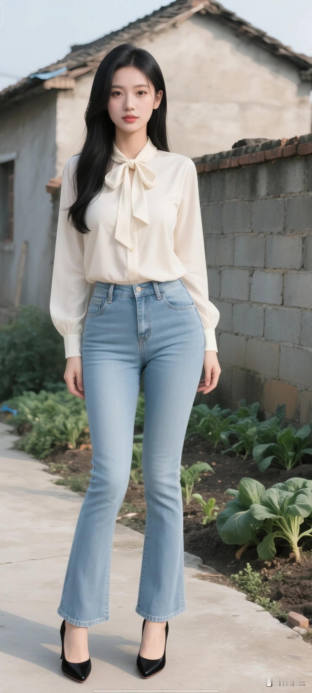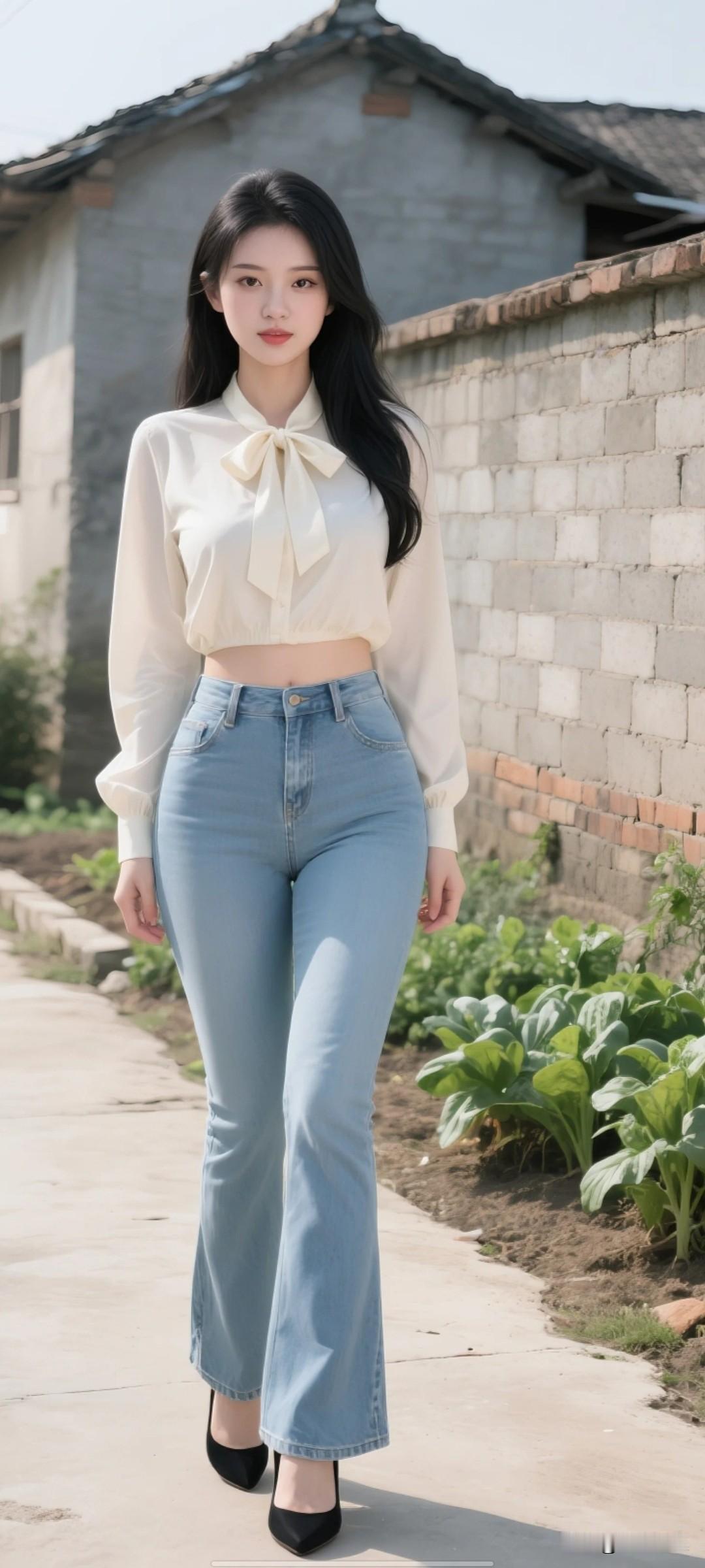清新田园风穿搭,浅蓝色牛仔裤搭配白色蝴蝶结衬衫,走在乡间小路上,享受自然之美。女人如何穿出含蓄的性感? 简约衬衫配裤子
